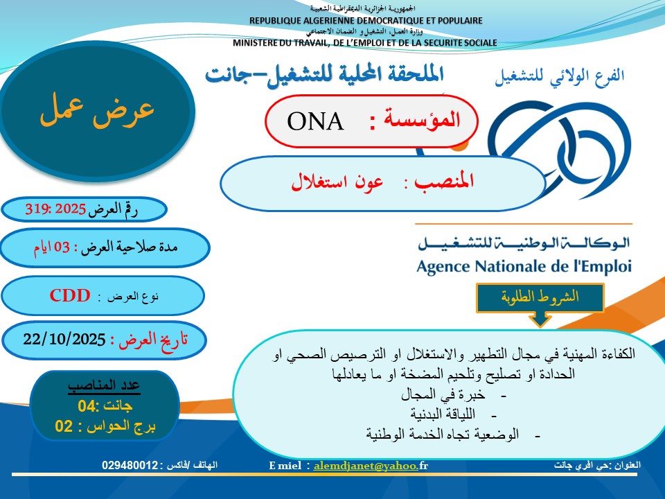 - اعلانات توظيف جديدة في ولاية: الجزائر العاصمة، البليدة، تيبازة، جيجل، برج بوعريريج، عين الدفلى، الأغواط، المسيلة، ورقلة، توقرت، الجلفة، أم البواقي، ميلة، خنشلة والطارف