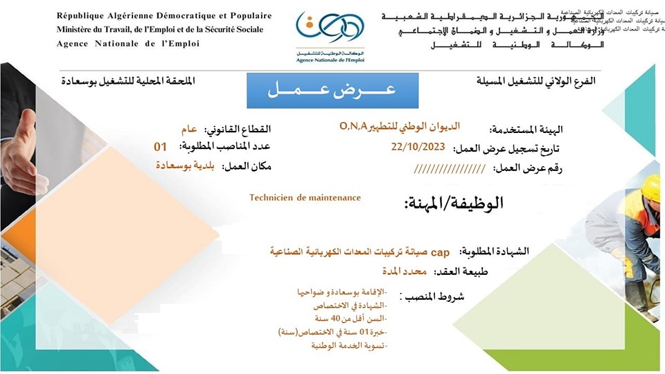 عرض عمل بالديوان الوطني للتطهير ONA شاركها Facebook Twitter LinkedIn Pinterest الفرع الولائي للتشغيـل المسيلة الملحقة المحلية للتشغيل