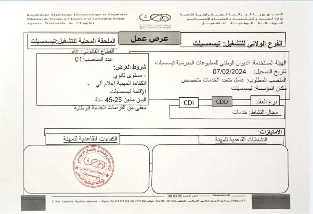 تعلن الملحقة المحلية للتشغيل تيسمسيلت عن عرض عمل بالديوان الوطني للمطبوعات المدرسية تيسمسيلت كما هو موضح ادناه