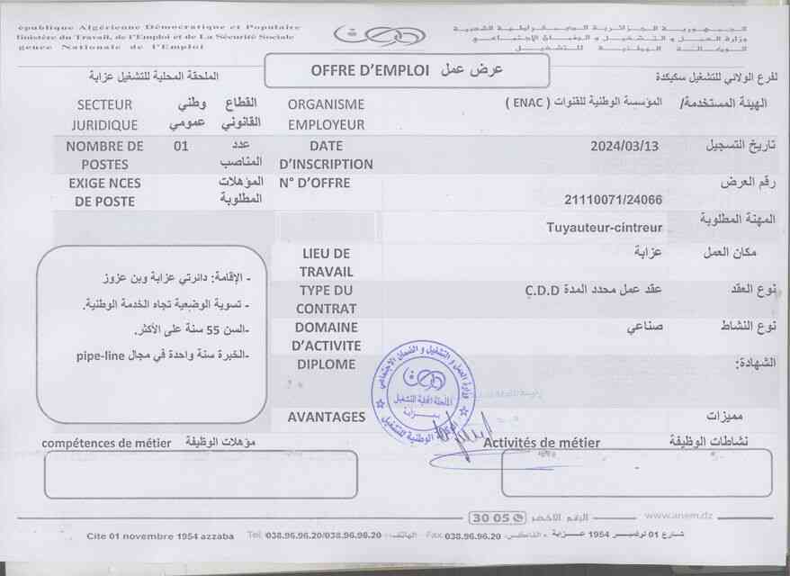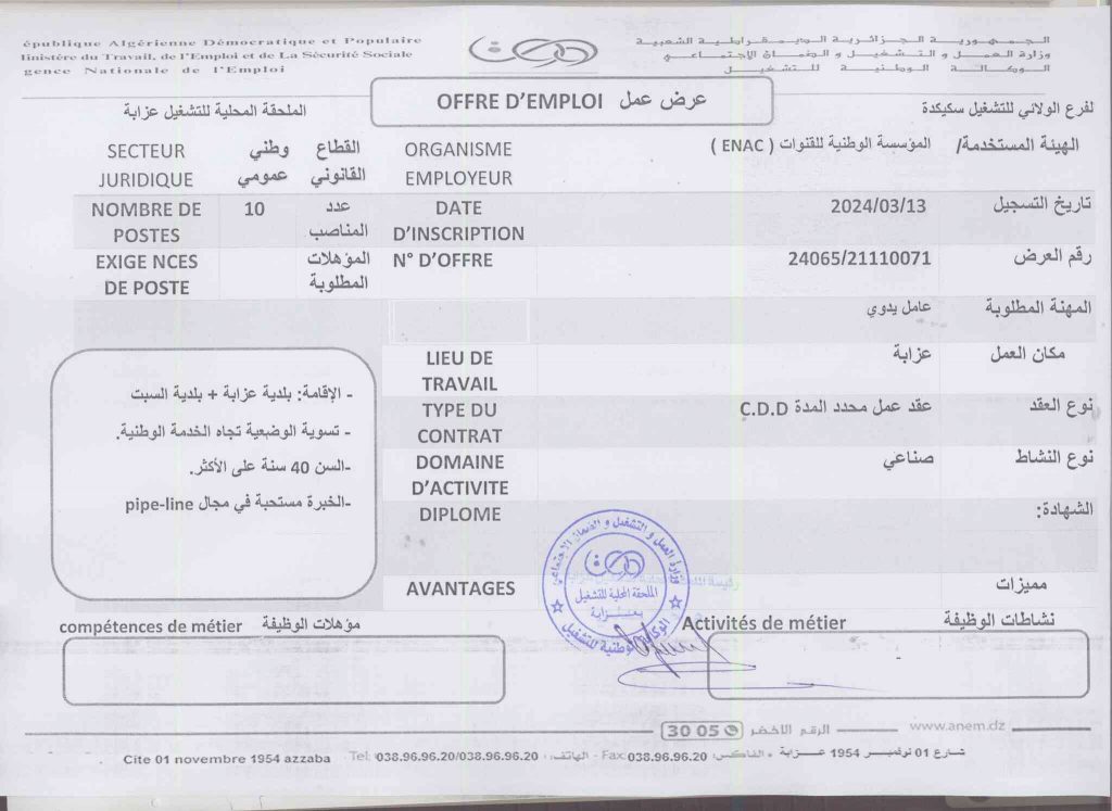 عرض عمل بالشركة الوطنية للقنوات ENAC التابعة لمجمع سوناطراك شاركها Facebook Twitter LinkedIn Pinterest الفرع الولائي للتشغيل سكيكدة الملحقة المحلية للتشغيل