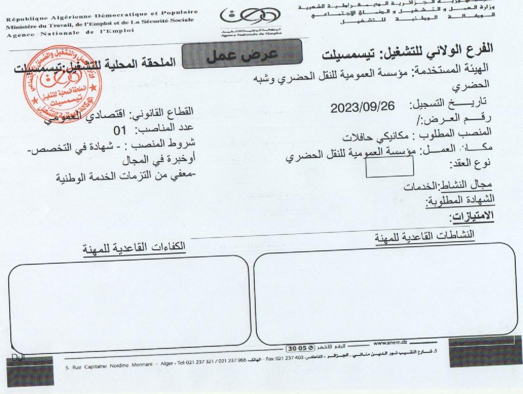 تعلن الملحقة المحلية للتشغيل تيسمسيلت عن عرض عمل بالمؤسسة العمومية للنقل الحضري وشبه الحضري كما هو موضح ادناه