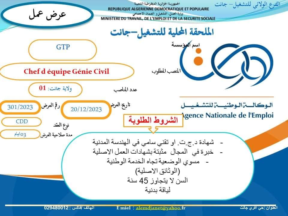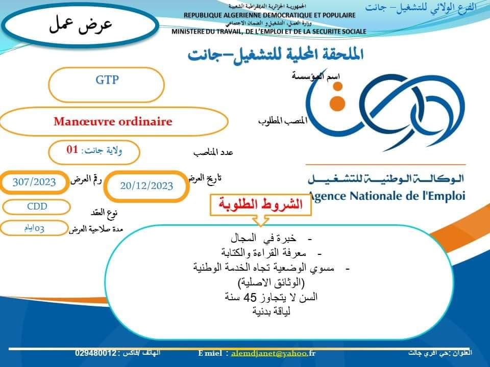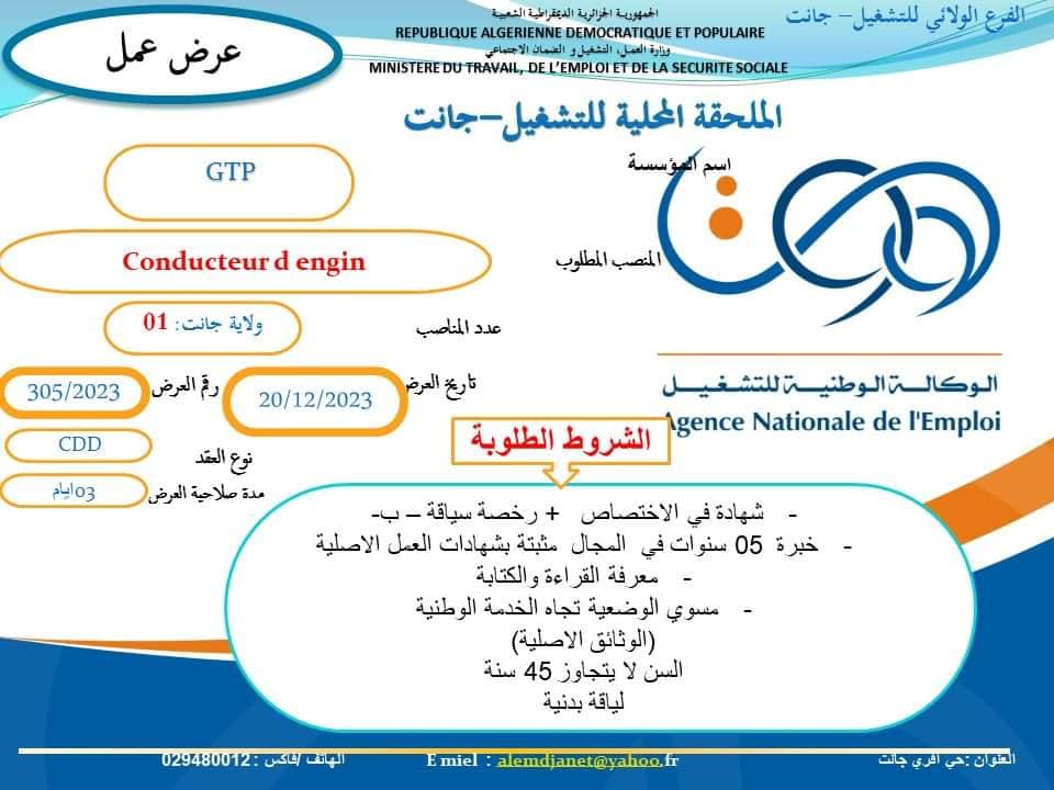 تعلن الملحقة المحلية للتشغيل جانت عن عرض عمل بالمؤسسة الوطنية البترولية للاشغال الكبرى GTP كما هو موضح ادناه