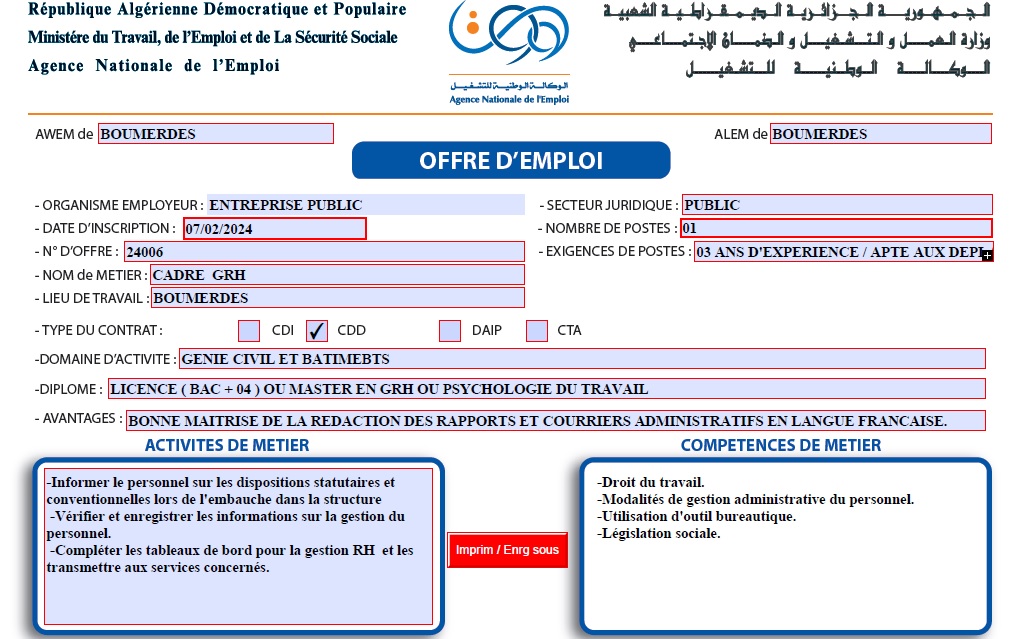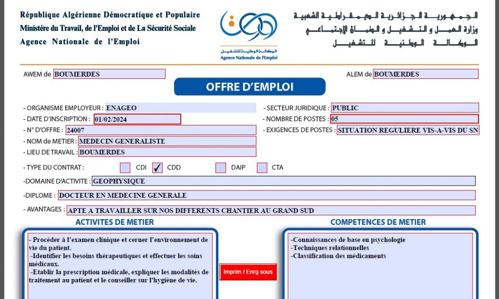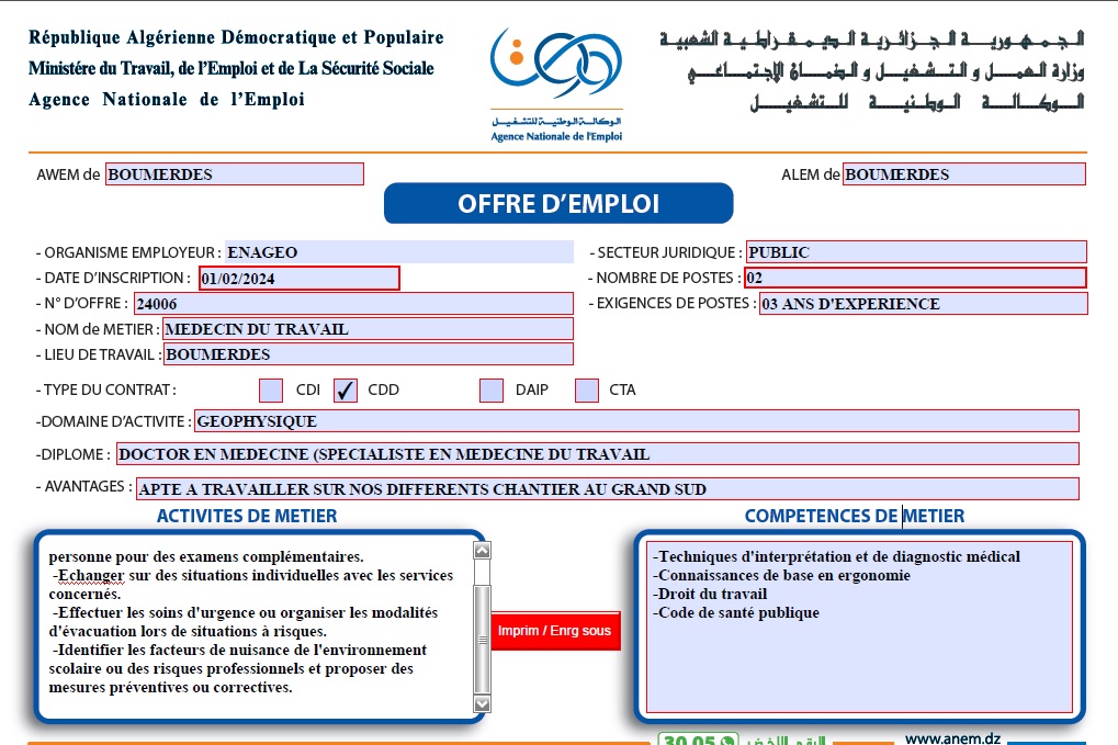 تعلن الملحقة المحلية للتشغيل ادرار عن عرض عمل بالمؤسسة الوطنية للجيوفيزياء ENAGEO كما هو موضح ادناه