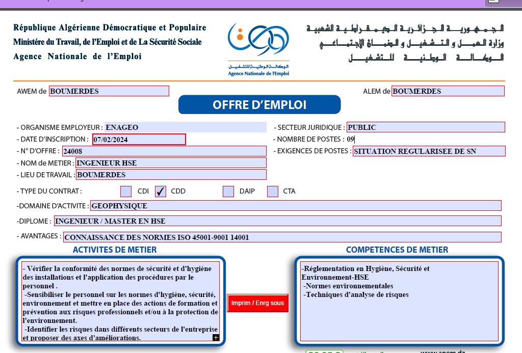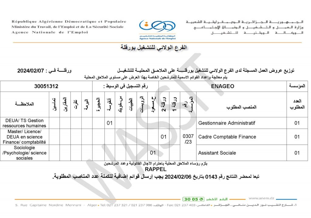 تعلن الملحقة المحلية للتشغيل بومرداس عن عرض عمل بالمؤسسة الوطنية للجيوفيزياء ENAGEO كما هو موضح ادناه