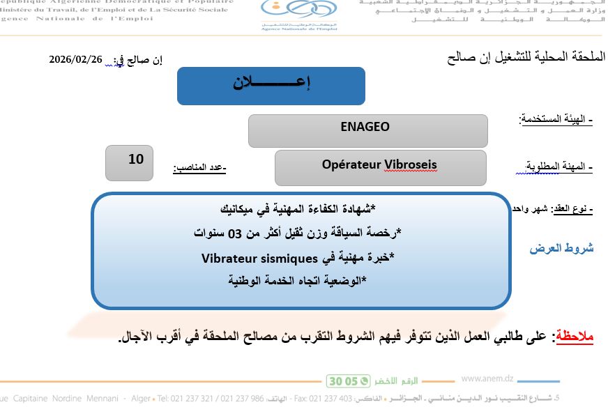 ملاحظة: على طالبي العمل الذين تتوفر فيهم الشروط التقرب من مصالح الملحقة في أقرب الآجال.