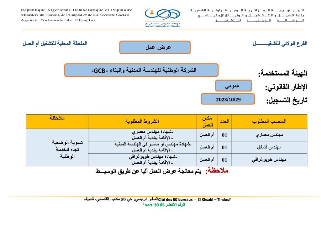 تعلن الملحقة المحلية للتشغيل ام العسل اعن عرض عمل بالمؤسسة الوطنية للهندسة المدنية ENGCB كما هو موضح ادناه