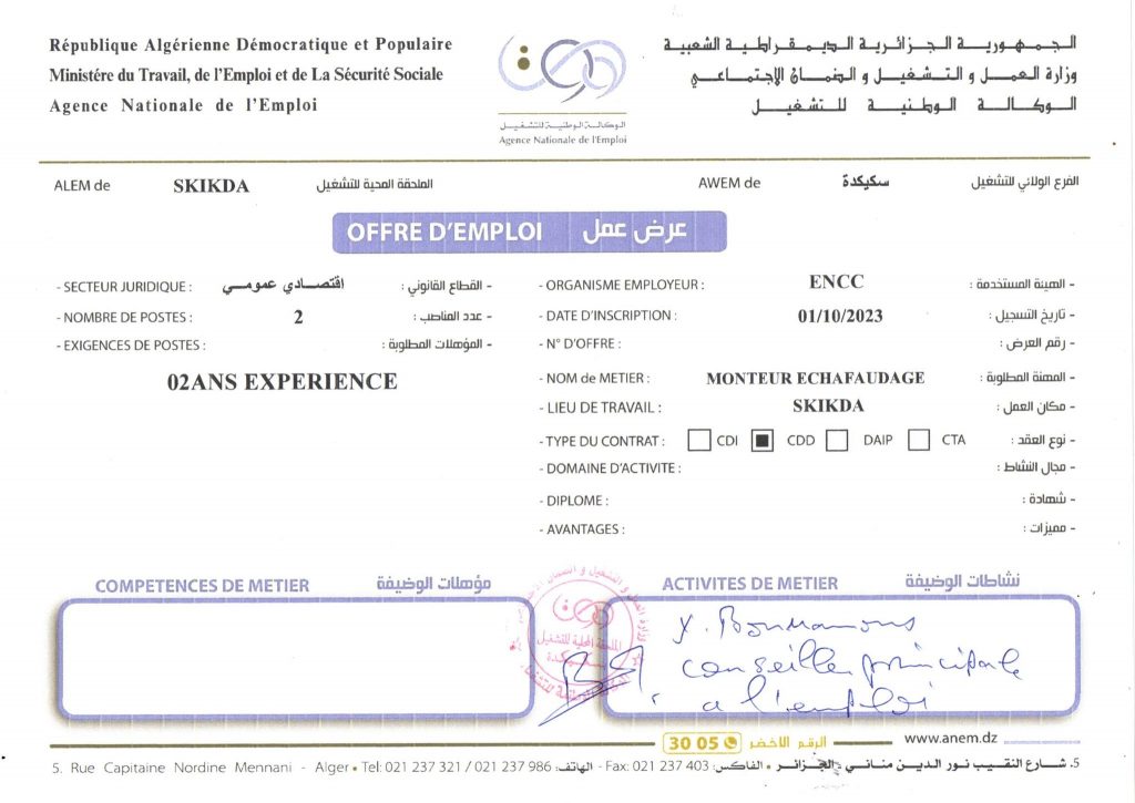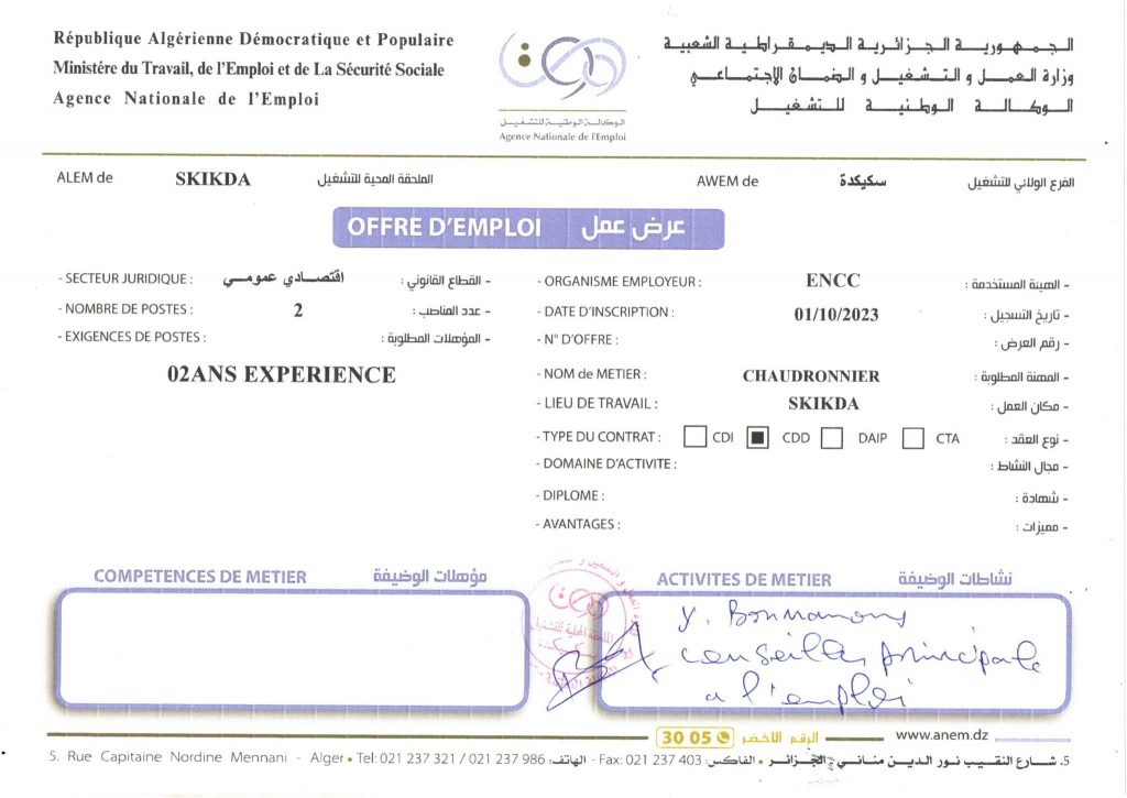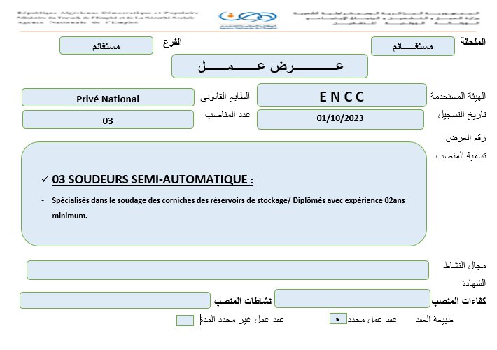 عرض عمل بالمؤسسة الوطنية للهياكل المعدنية والنحاسيية ENCC شاركها Facebook Twitter LinkedIn Pinterest الفرع الولائي للتشغيـل مستغانم الملحقة المحلية للتشغيل مستغانم عرض عمل المؤسسة الوطنية للهياكل المعدنية والنحاسيية ENCC ads المناصب المطلوبة: موضحين في الصورة المرفقة عدد المناصب 03 مكان العمل :