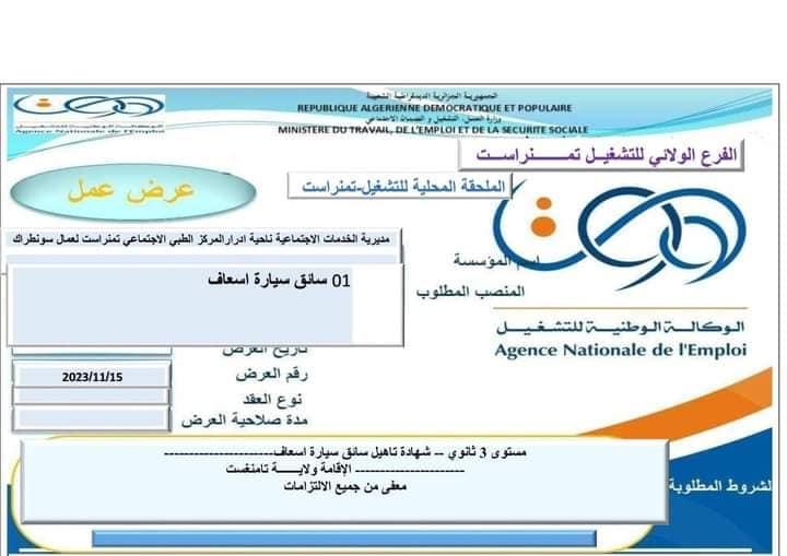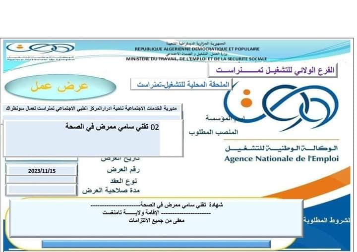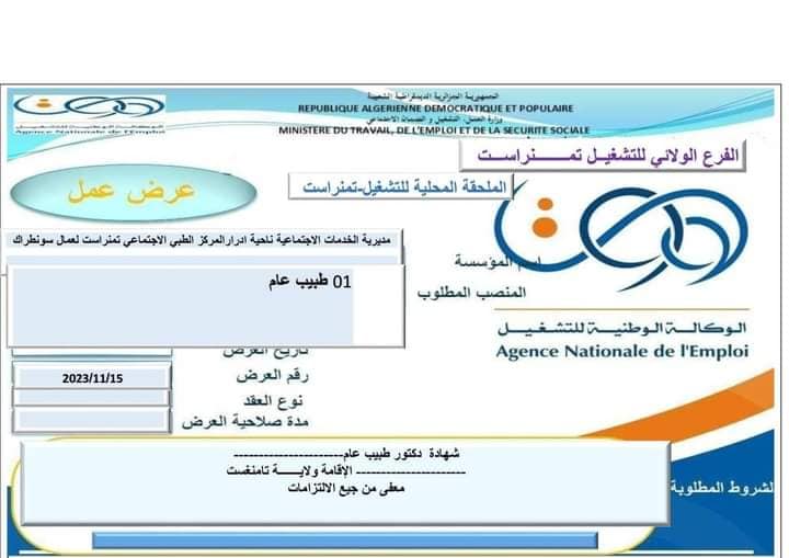 تعلن الملحقة المحلية للتشغيل تمنراست عن عرض عمل بالمركز الطبي لعمال سوناطراك Sonatrach كما هو موضح ادناه