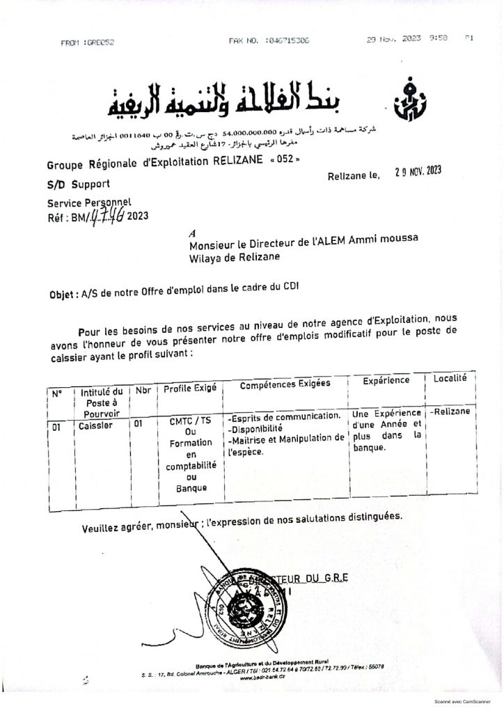عرض عمل ببنك الفلاحة و التنمية الريفية badr شاركها Facebook Twitter LinkedIn Pinterest الفرع الولائي للتشغيـل