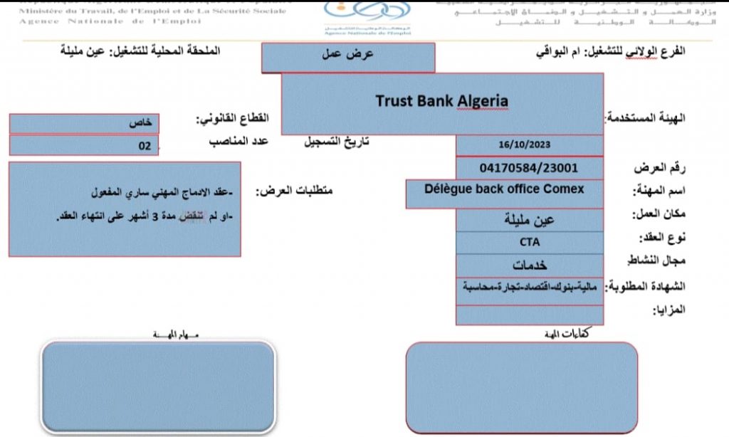 تعلن الملحقة المحلية للتشغيل عين مليلة عن عرض عمل ببنك TRUST BANK ALGERIA كما موضح ادناه