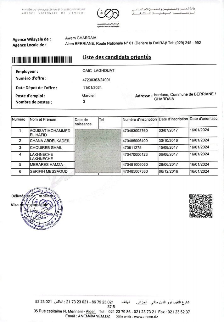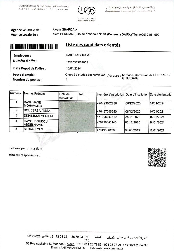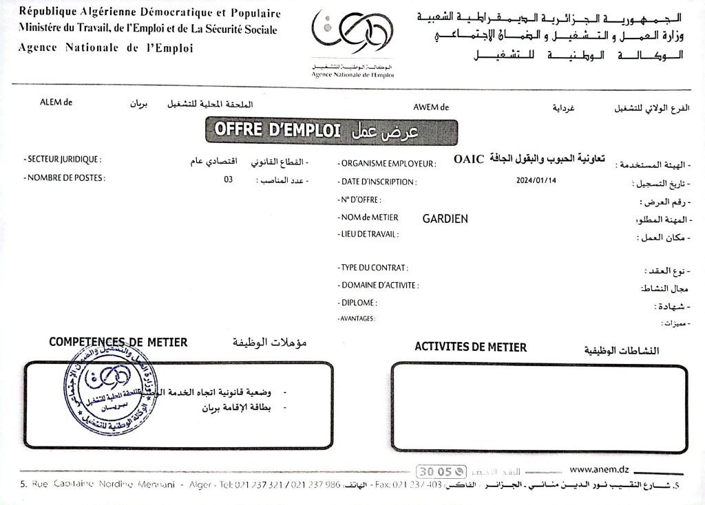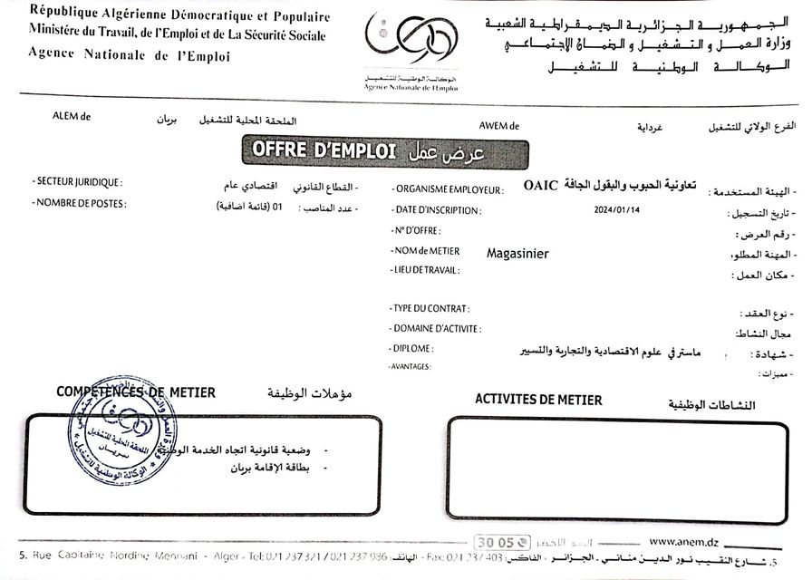 عرض عمل بتعاونية الحبوب والبقول الجافة OAIC شاركها Facebook Twitter LinkedIn Pinterest الفرع الولائي للتشغيـل