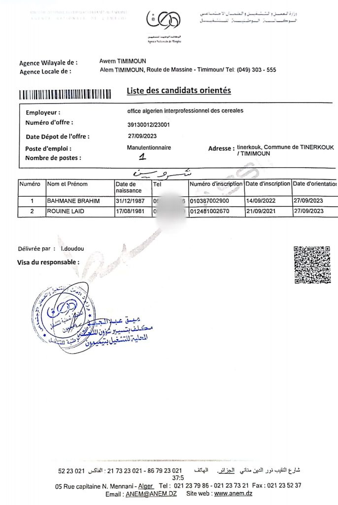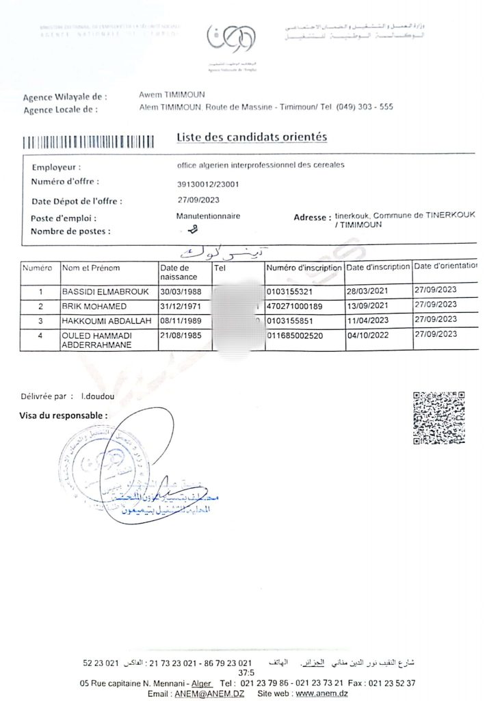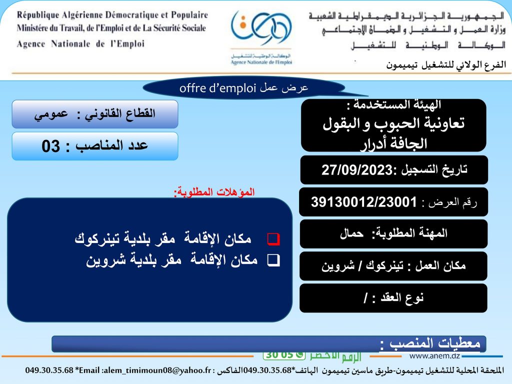 يعلن الفرع الولائي للتشغيـل تيميمون عن عرض عمل بتعاونية الحبوب و البقول الجافة كما هو موضح ادناه