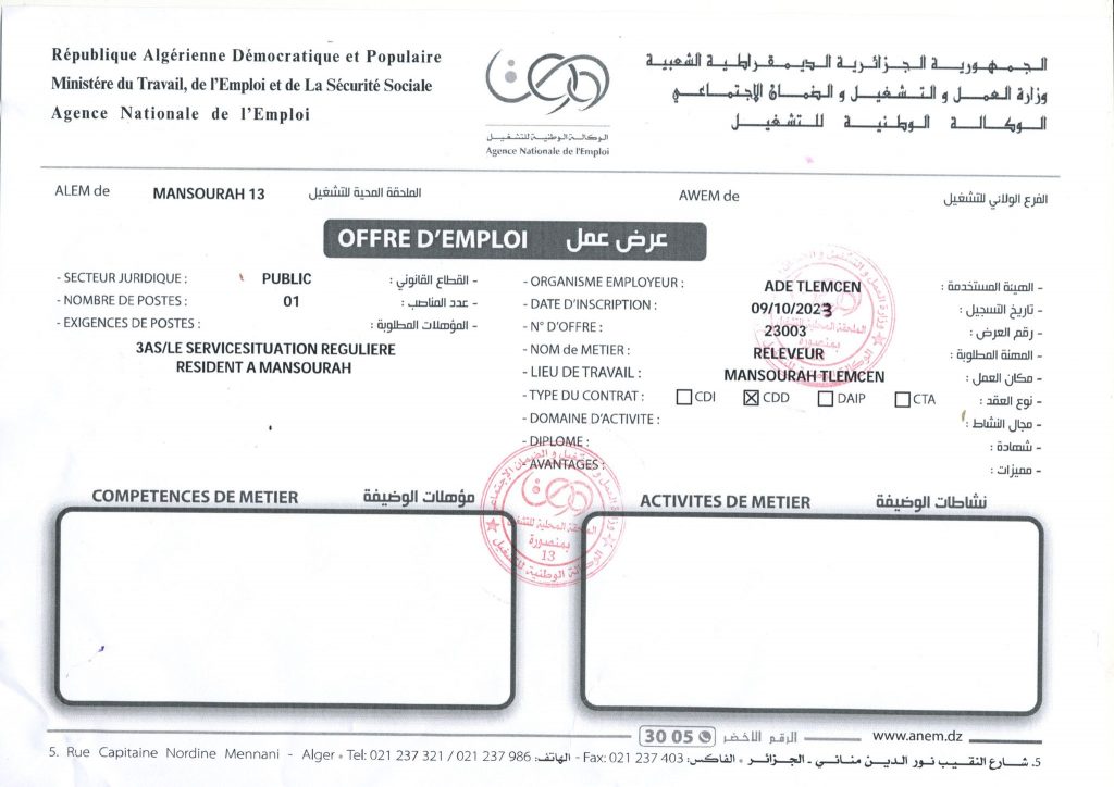 ملاحظة : العرض تم نشره على مستوى الملحقة المحلية للتشغيل تلمسان
