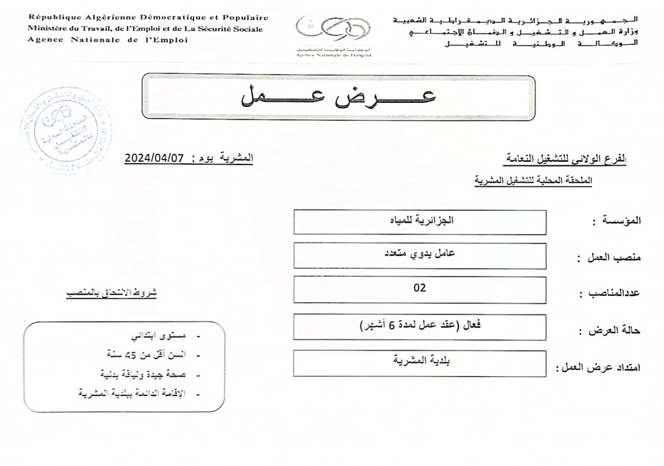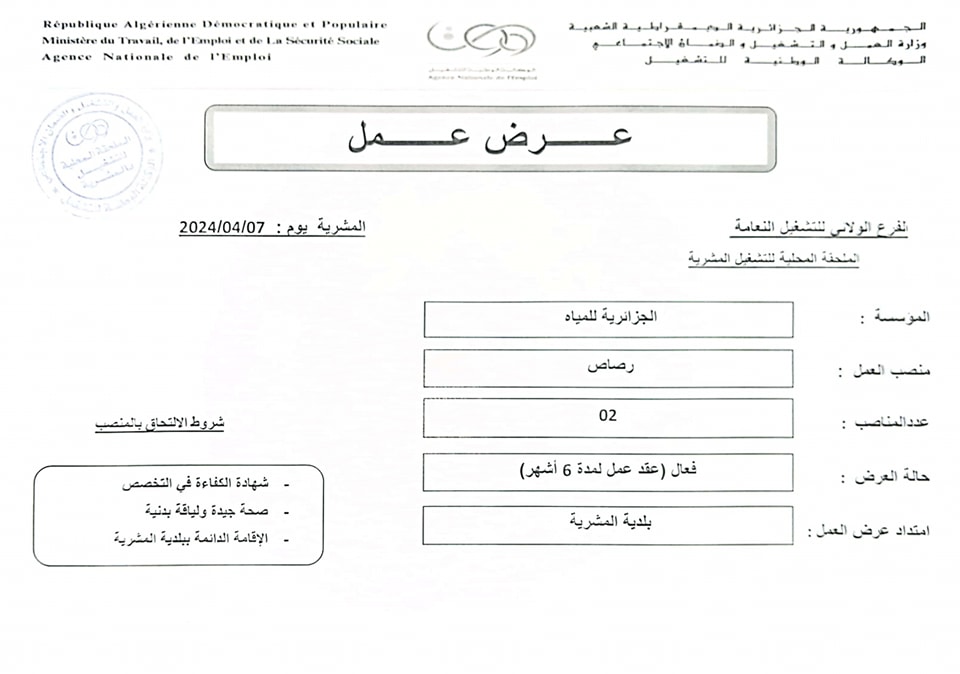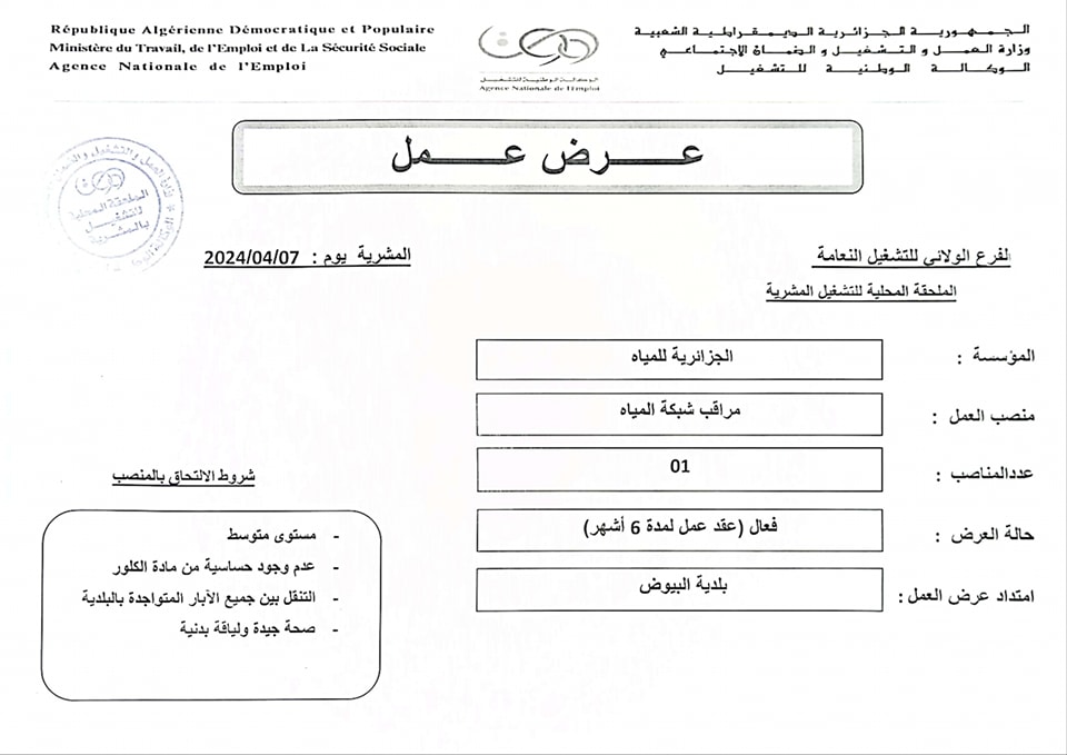 عرض عمل بشركة الجزائرية للمياه ADE شاركها Facebook Twitter LinkedIn Pinterest الفرع الولائي للتشغيل النعامة الملحقة المحلية للتشغيل
