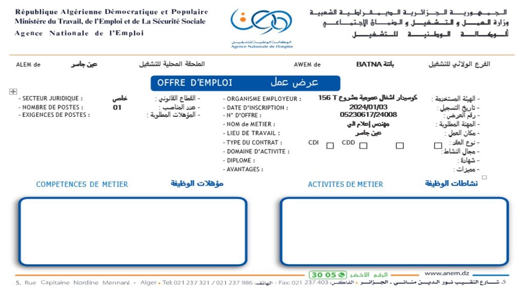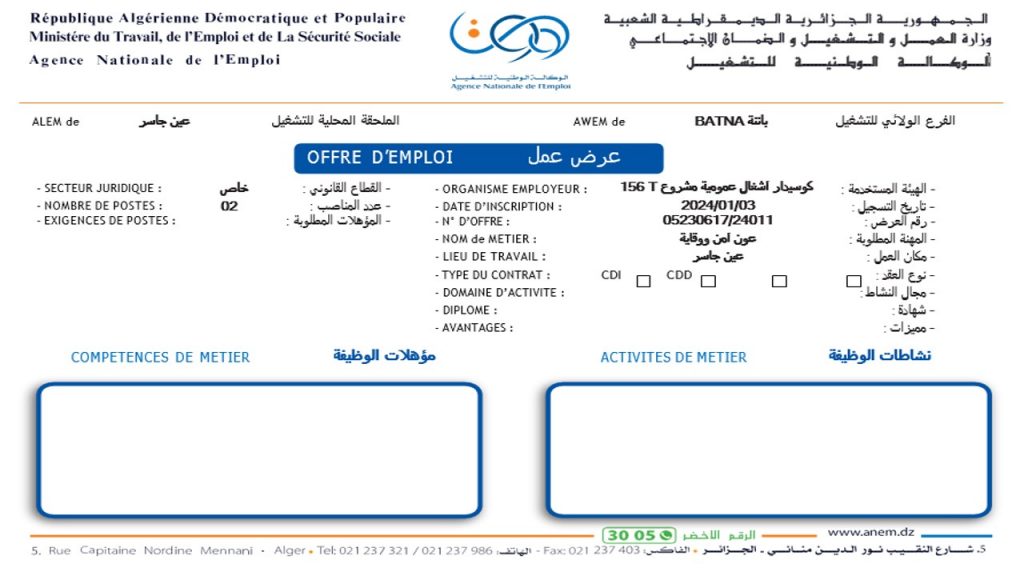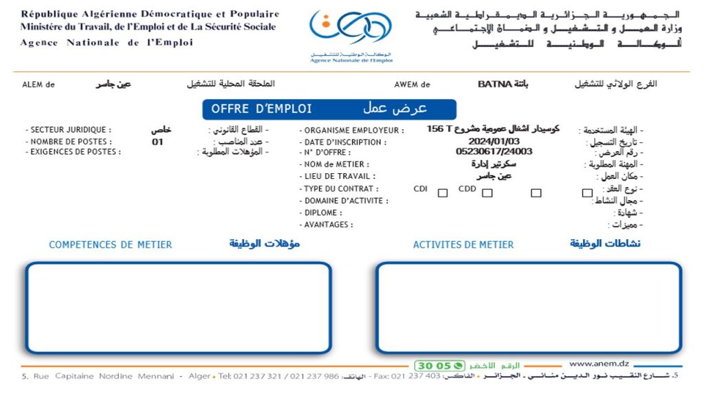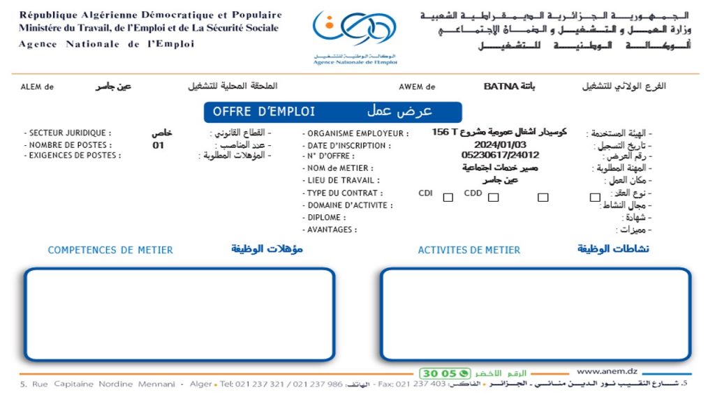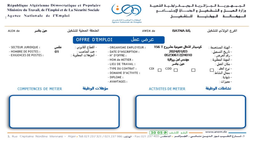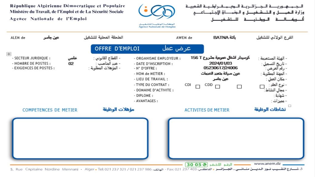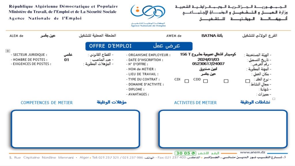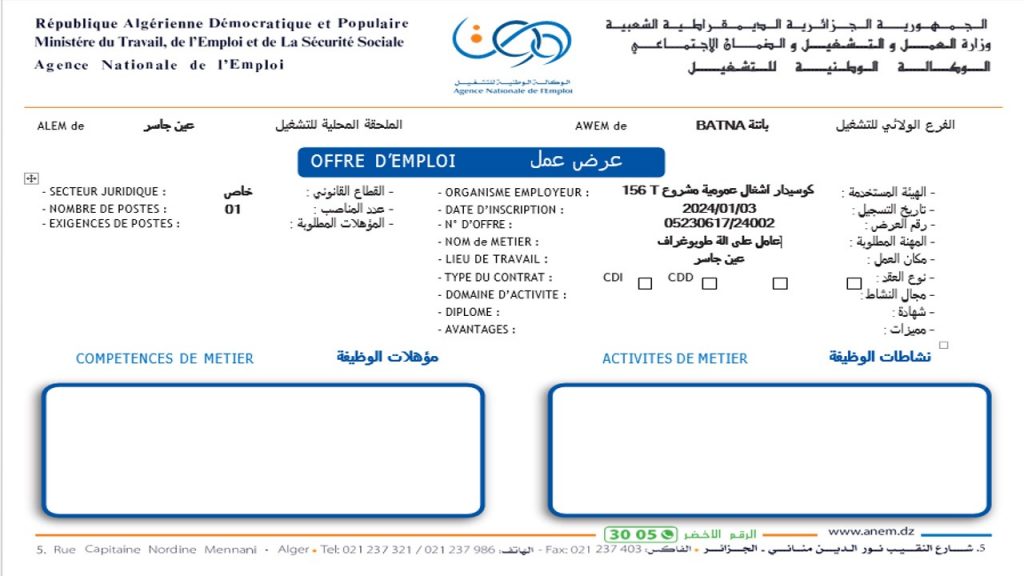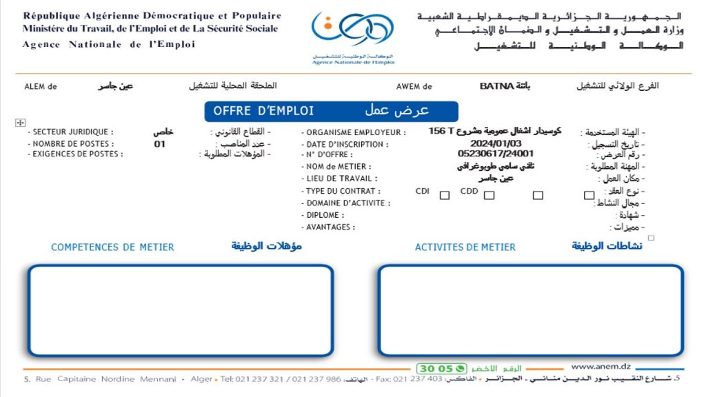 عرض عمل بشركة كوسيدار اشغال عمومية Cosider شاركها Facebook Twitter LinkedIn Pinterest الفرع الولائي للتشغيـل