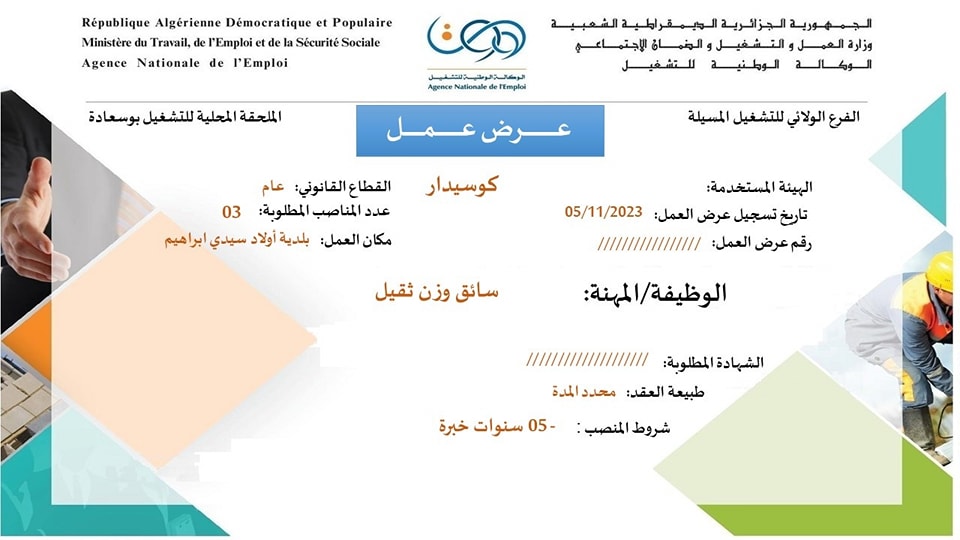 تعلن الملحقة المحلية للتشغيل بوسعادة عرض عمل بشركة كوسيدار Cosider كما هو موضح ادناه