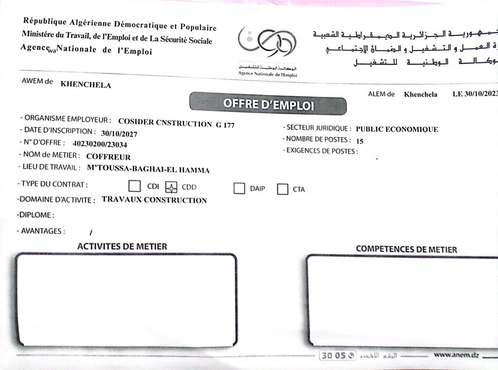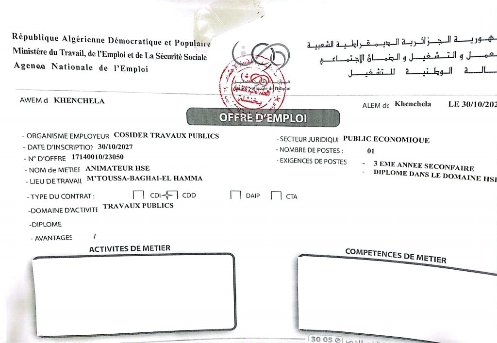 تعلن الملحقة المحلية للتشغيل خنشلة اعن عرض عمل بشركة كوسيدار Cosider كما هو موضح ادناه