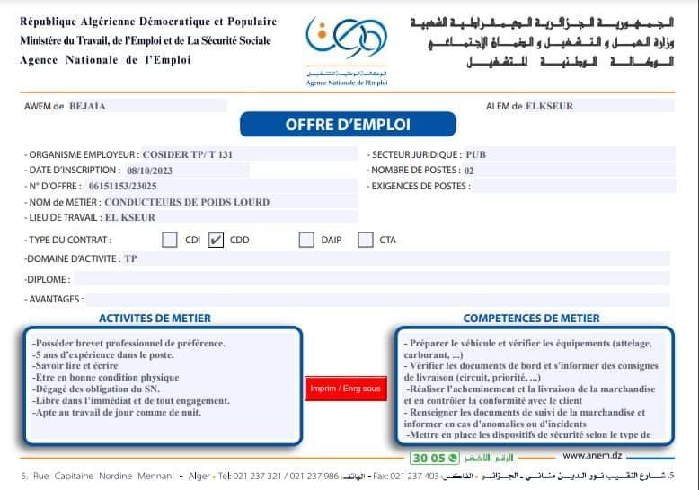تعلن الملحقة المحلية للتشغيل القصر بجاية عرض عمل بشركة كوسيدار COSIDER كما هو موضح ادناه