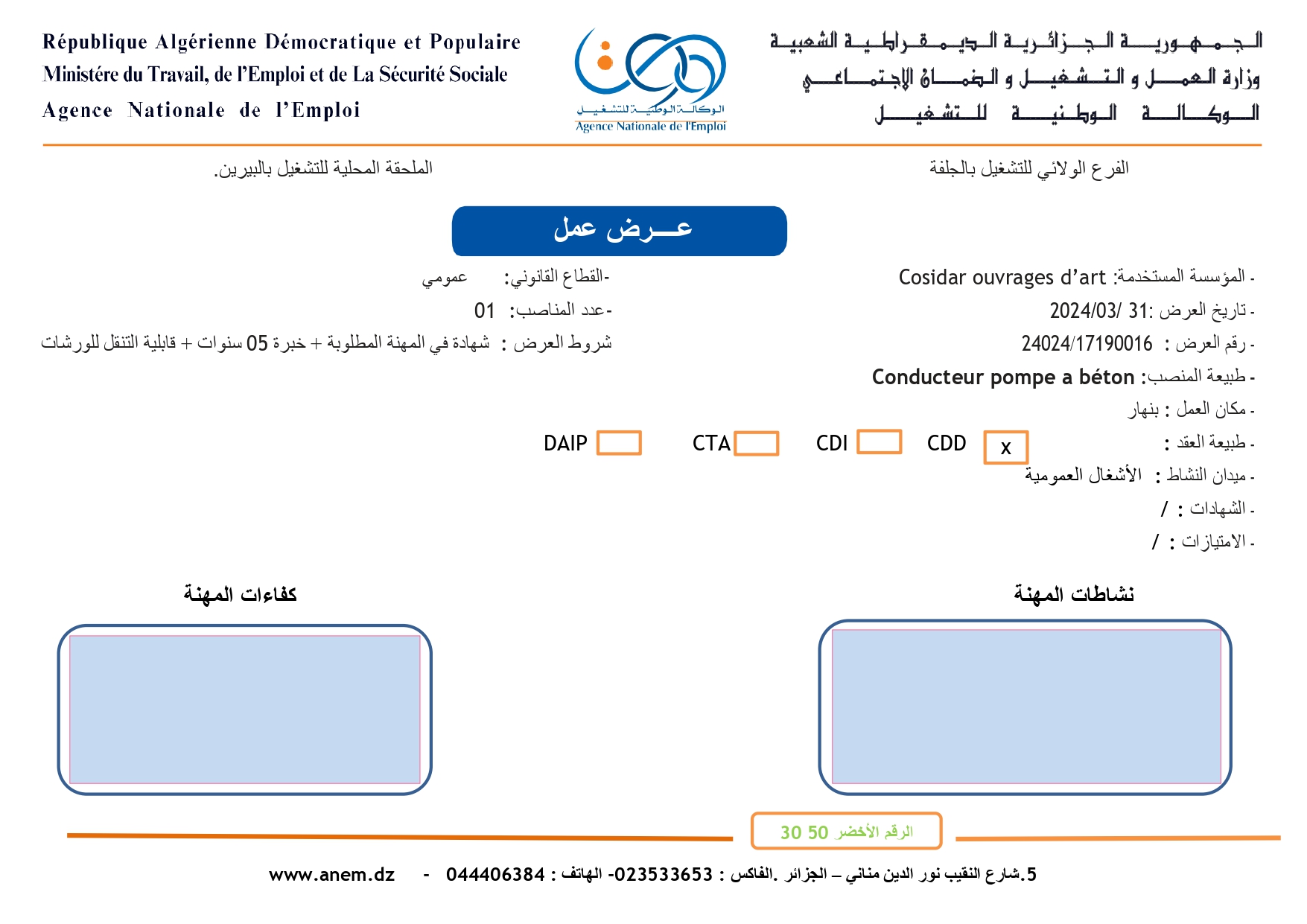 عرض عمل بشركة كوسيدار Cosider ouvrages d’art شاركها Facebook Twitter LinkedIn Pinterest الفرع الولائي للتشغيل الجلفة الملحقة المحلية للتشغيل