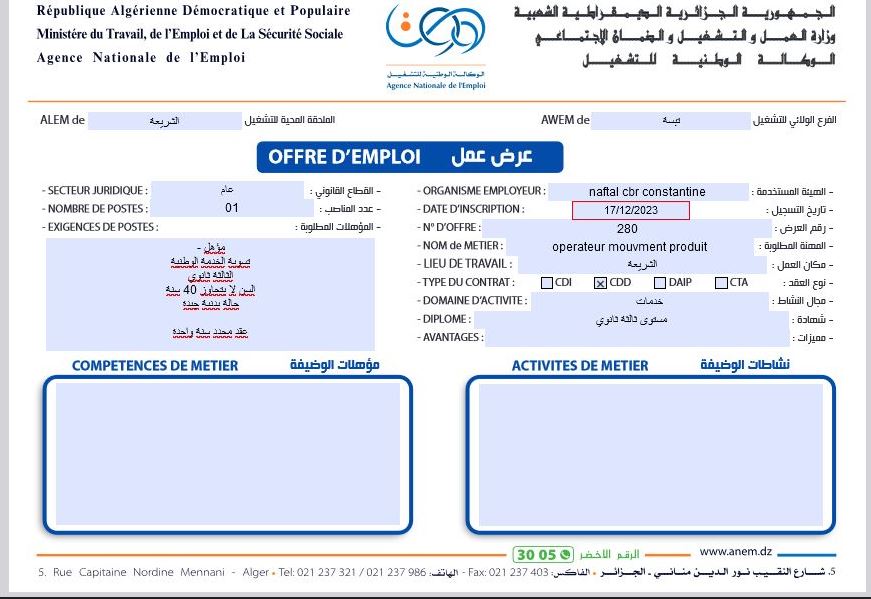 تعلن الملحقة المحلية للتشغيل الشريعة عن عرض عمل بشركة نفطال Naftal Cbr Constantine كما هو موضح ادناه