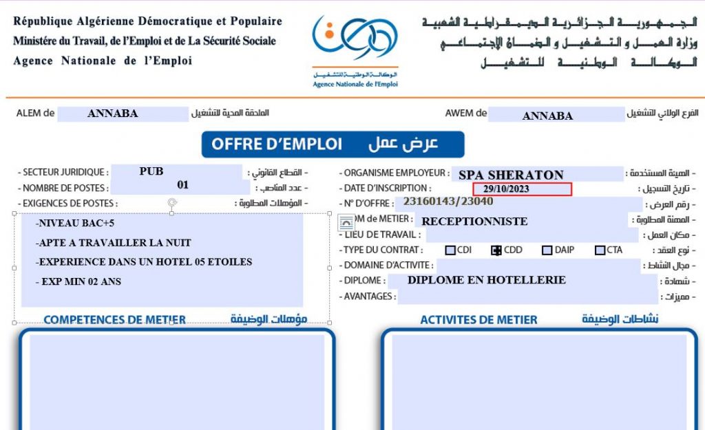 تعلن الملحقة المحلية للتشغيل عنابة اعن عرض عمل بفندق الشيراتون Spa sheraton كما هو موضح ادناه