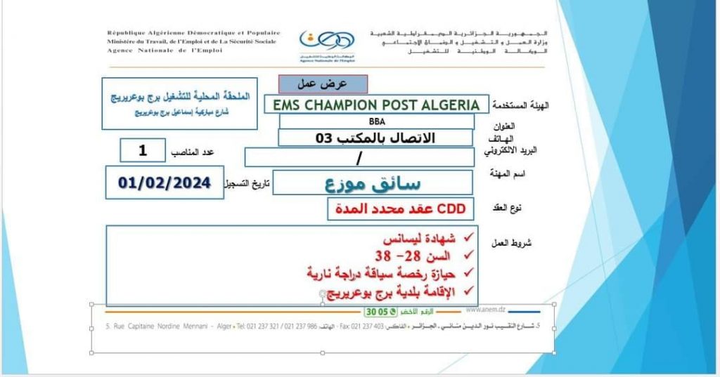 تعلن الملحقة المحلية للتشغيل برج بوعريريج عن عرض عمل بمؤسسة البريد السريع EMS CHAMPION POST ALGÉRIE كما هو موضح ادناه