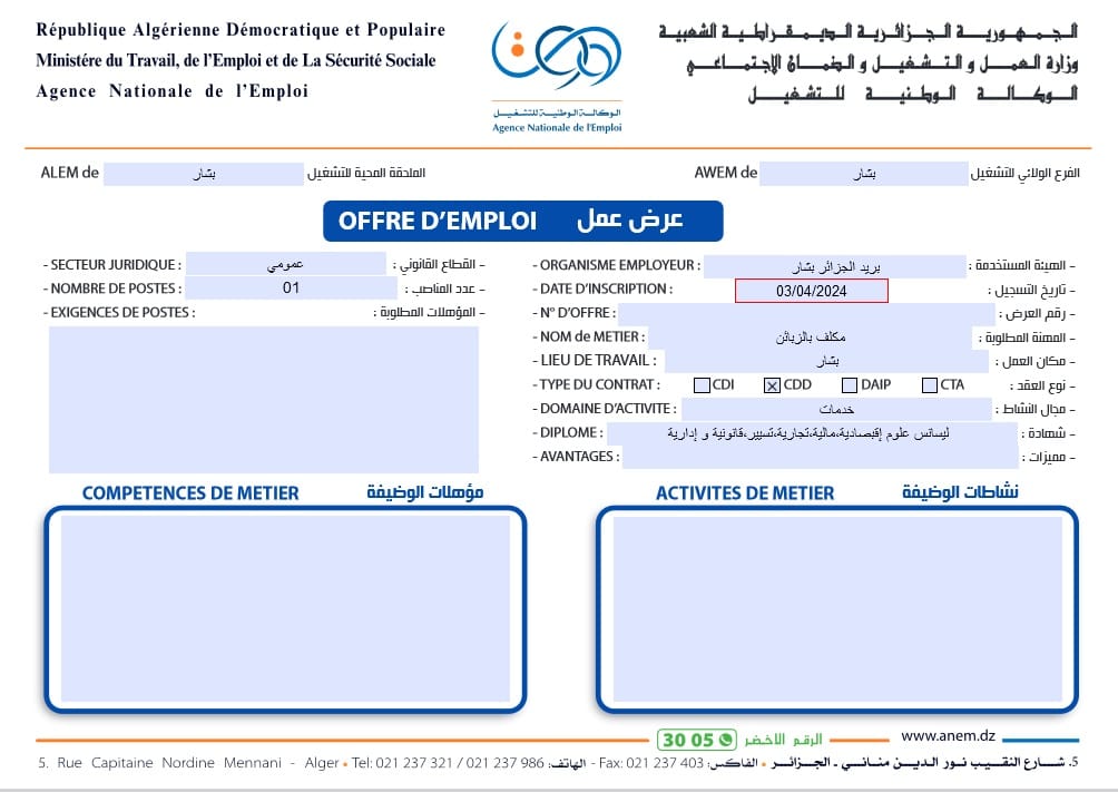 عرض عمل بمؤسسة بريد الجزائر ALGERIE POSTE شاركها Facebook Twitter LinkedIn Pinterest الفرع الولائي للتشغيل بشار الملحقة المحلية للتشغيل