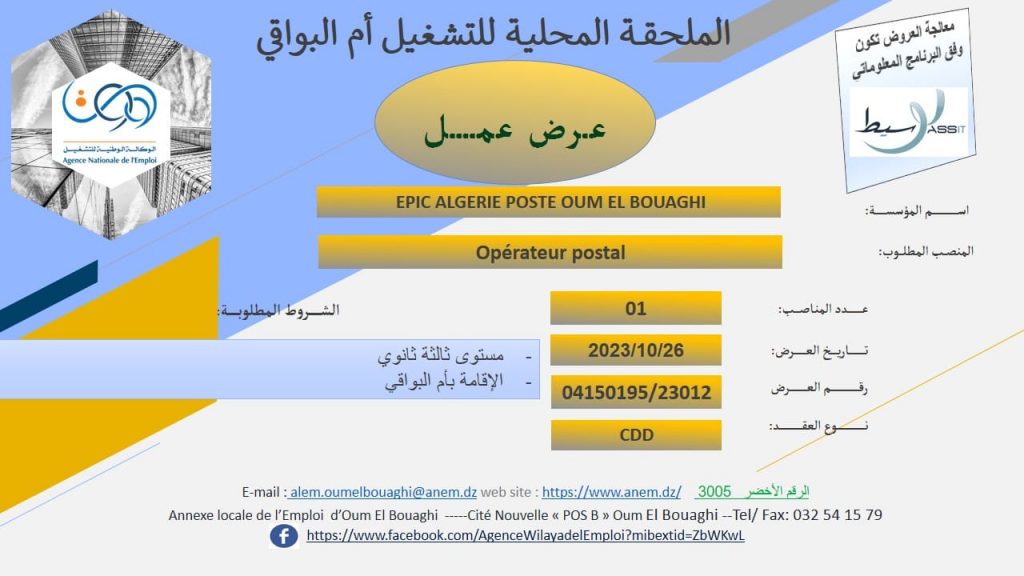 عرض عمل بمؤسسة بريد الجزائر ALGERIE POSTE شاركها Facebook Twitter LinkedIn Pinterest الفرع الولائي للتشغيـل ام البواقي الملحقة المحلية للتشغيل