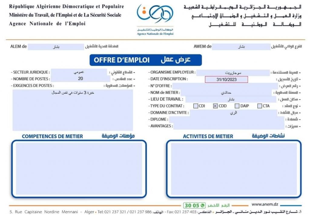 تعلن الملحقة المحلية للتشغيل بشار اعن عرض عمل بمؤسسة سوجارويت SOGERHWIT SPA كما هو موضح ادناه
