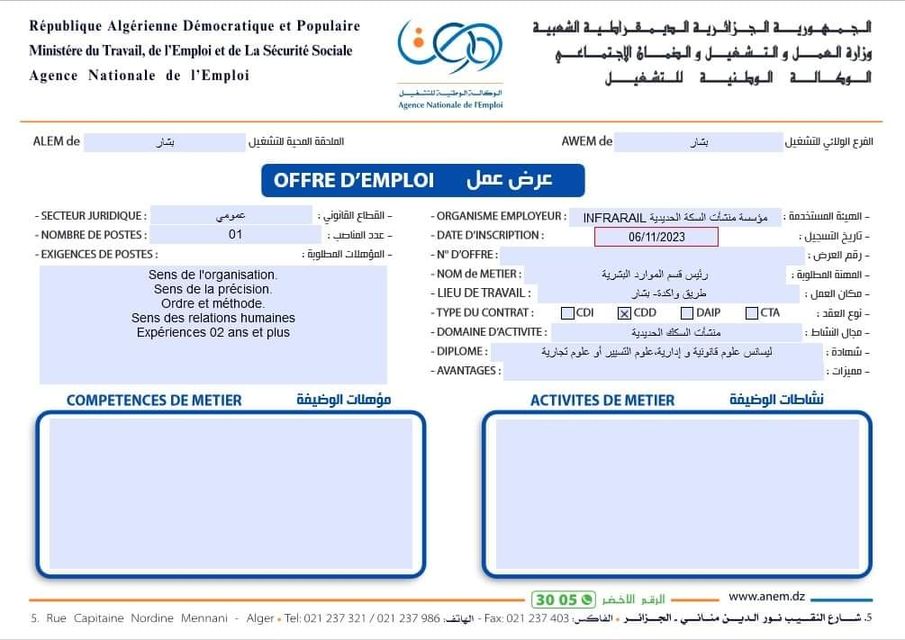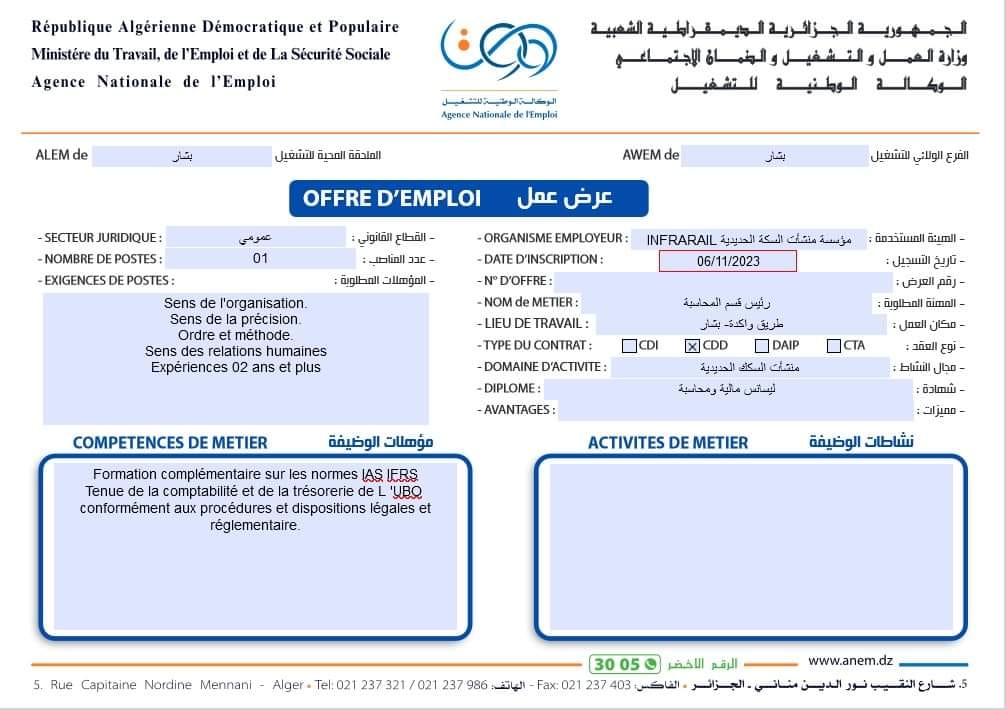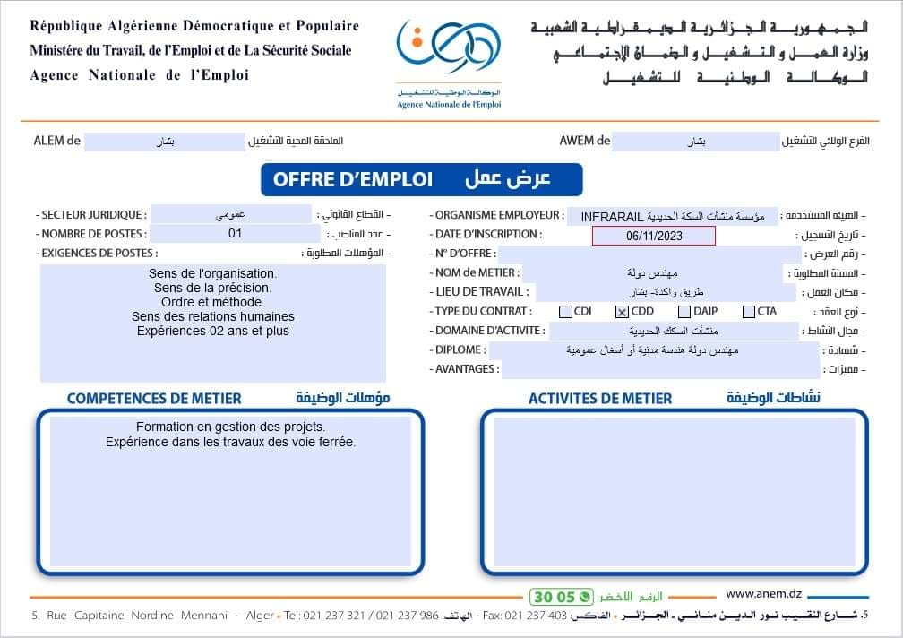 عرض عمل بمؤسسة منشات السكة الحديدية INFRARAIL شاركها Facebook Twitter LinkedIn Pinterest الفرع الولائي للتشغيـل بشار الملحقة المحلية للتشغيل