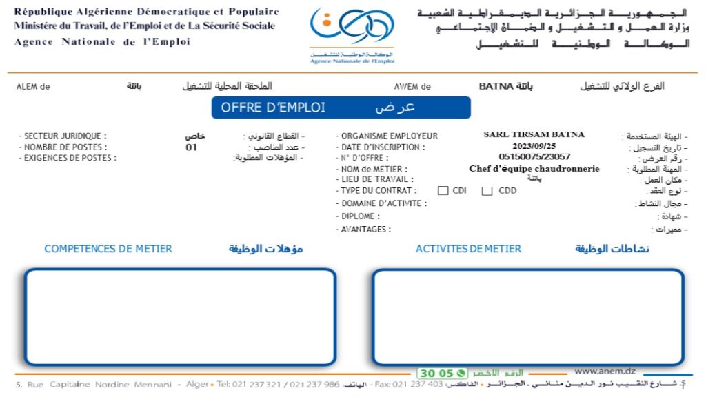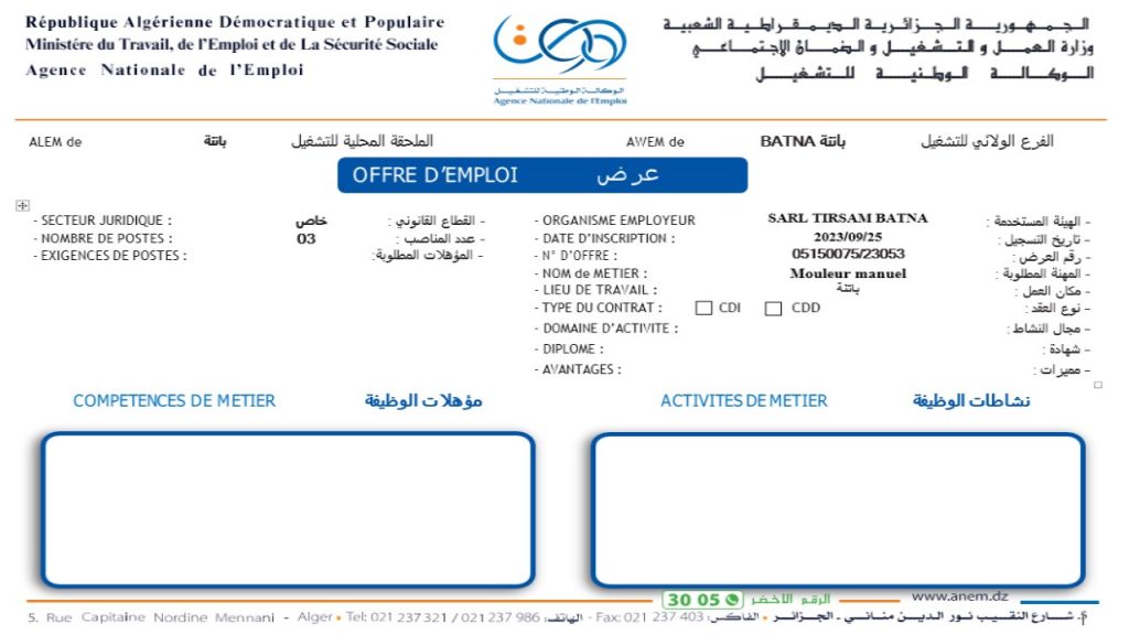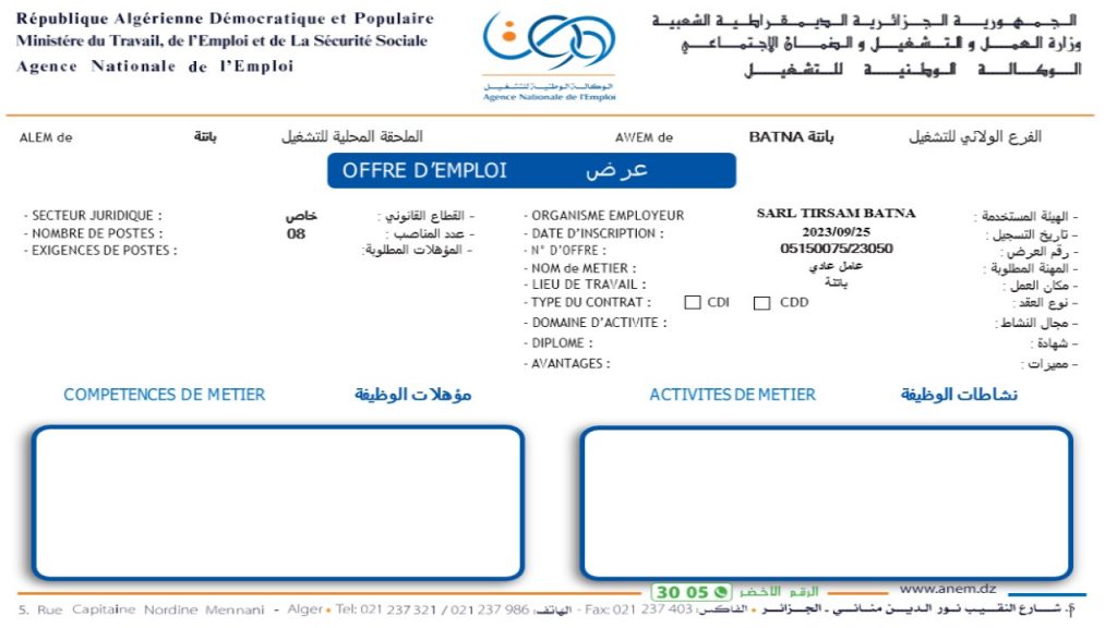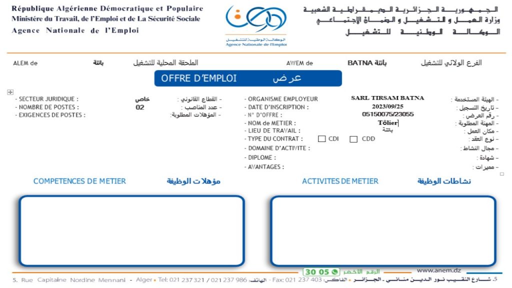 عرض عمل بمؤسسة SARL TIRSAM BATNA (42 منصب) شاركها Facebook Twitter LinkedIn Pinterest الفرع الولائي للتشغيـل باتنة الملحقة المحلية للتشغيل