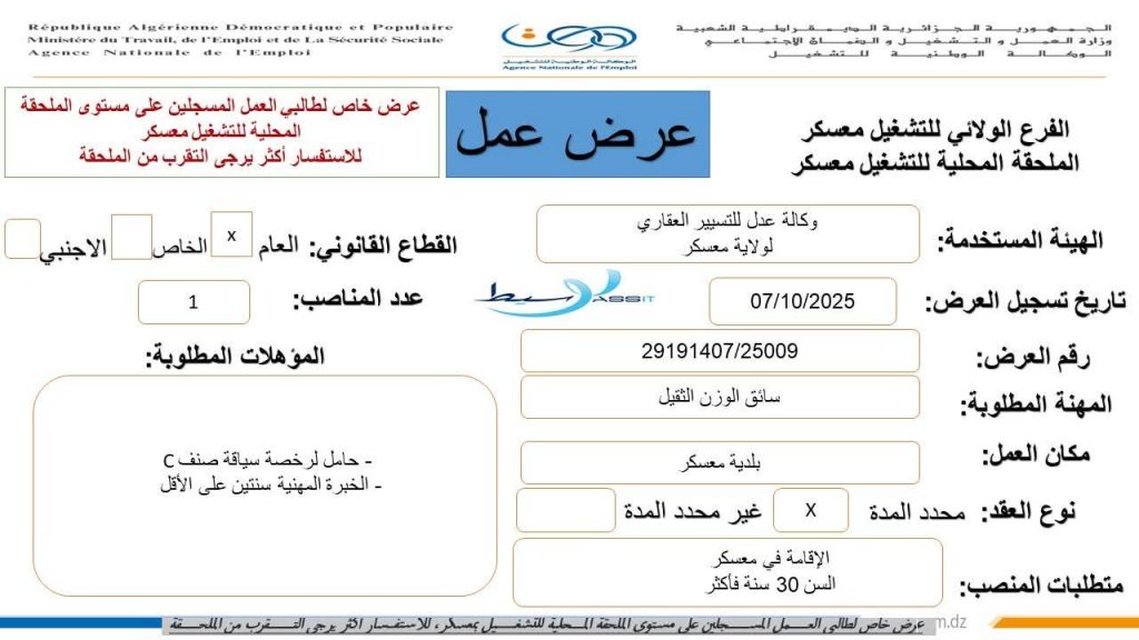 عرض خاص لطالبي العمل المسجلين على مستوى الملحقة المحلية للتشغيل معسكر
