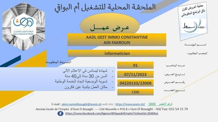 عرض عمل بوكالة عدل GEST IMMO AADL شاركها Facebook Twitter LinkedIn Pinterest الفرع الولائي للتشغيـل ام البواقي الملحقة المحلية للتشغيل