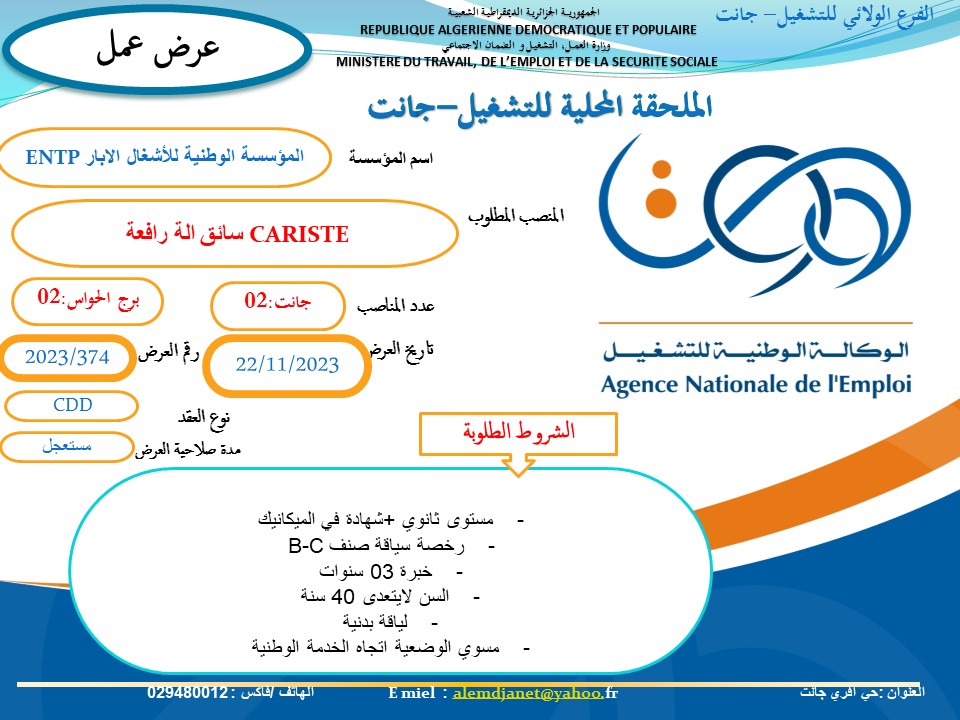 عرض عمل جديد بالمؤسسة الوطنية للاشغال في الآبار ENTP شاركها Facebook Twitter LinkedIn Pinterest الفرع الولائي للتشغيـل
