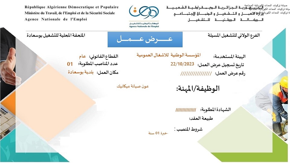 عرض عمل جديد بالمؤسسة الوطنية للاشغال العمومية شاركها Facebook Twitter LinkedIn Pinterest الفرع الولائي للتشغيـل المسيلة الملحقة المحلية للتشغيل