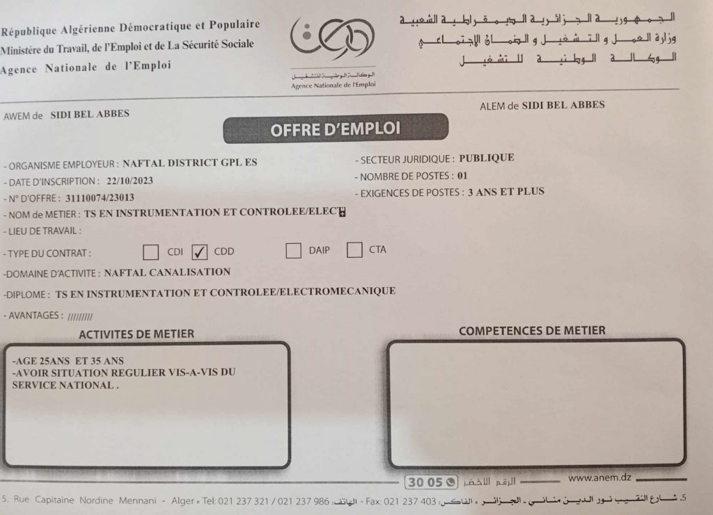 عرض عمل جديد بمؤسسة نفطال NAFTAL DISTRICT GPL شاركها Facebook Twitter LinkedIn Pinterest الفرع الولائي للتشغيـل سيدي بلعباس الملحقة المحلية للتشغيل