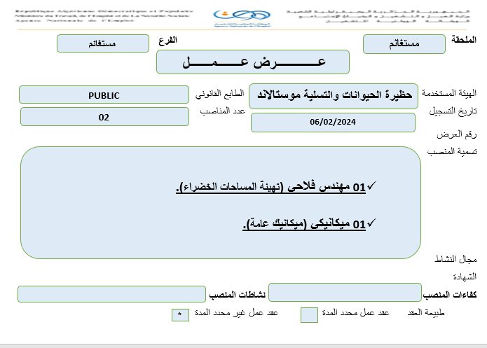 تعلن الملحقة المحلية للتشغيل مستغانم عن عرض عمل بحظيرة الحيوانات والتسلية موستالاند كما هو موضح ادناه