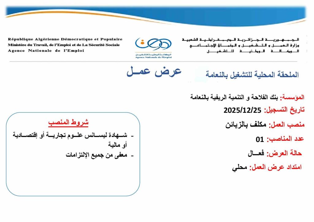 المؤسسة: بنك الفلاحة والتنمية الريفية بالنعامة BADR