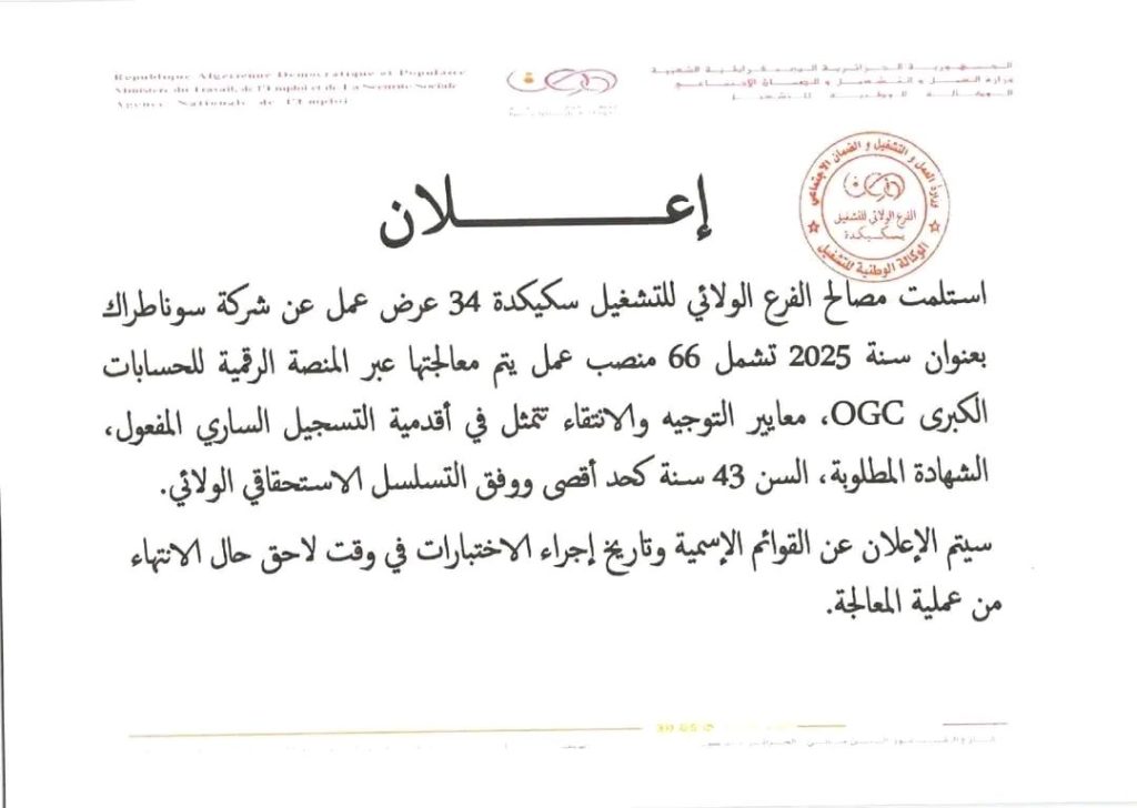 استلمت مصالح الفرع الولائي للتشغيل سكيكدة 34 عرض عمل عن شركة سوناطراك بعنوان سنة 2025 تشمل 66 منصب عمل يتم معالجتها عبر المنصة الرقمية للحسابات الكبرى OGC، معايير التوجيه والانتقاء تتمثل في أقدمية التسجيل الساري المفعول، الشهادة المطلوبة، السن 43 سنة كحد أقصى وفق التسلسل الاستحقاقي الولائي.