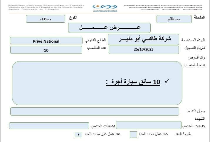 عرض عمل 10 سائقين سيارة اجرة بشركة طاكسي ابو منير شاركها Facebook Twitter LinkedIn Pinterest الفرع الولائي للتشغيـل مستغانم الملحقة المحلية للتشغيل