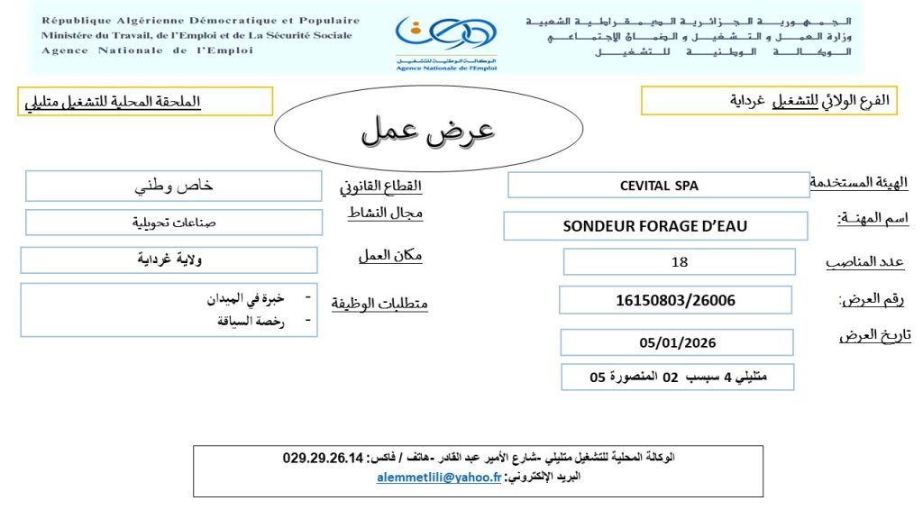 | SONDEUR FORAGE D’EAU | 18 | 16150803/26006 | 05/01/2026 | – خبرة في الميدان – رخصة السياقة |