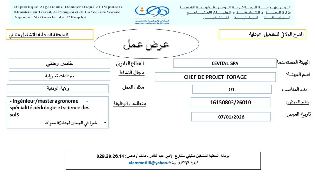| CHEF DE PROJET FORAGE | 01 | 16150803/26010 | 07/01/2026 | – مهندس/ماستر زراعي تخصص علم التربة (Pédologie et science des sols) – خبرة في الميدان لمدة 05 سنوات |