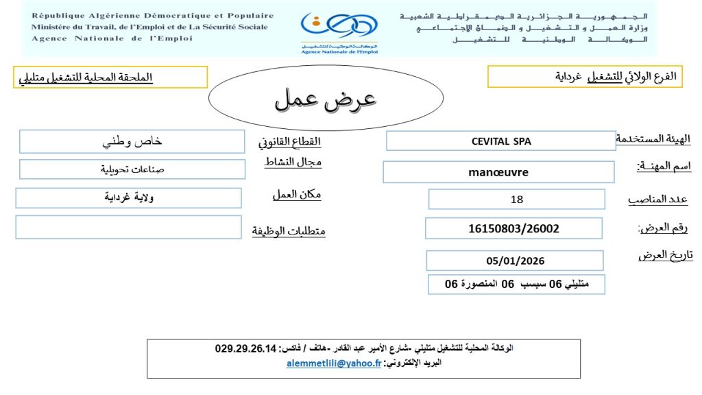 | manœuvre (عامل يدوي) | 18 | 16150803/26002 | 05/01/2026 | (لم يتم تحديد شروط إضافية في الخانة) |