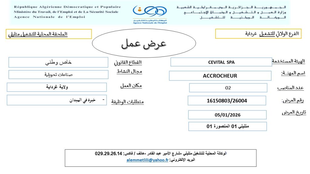 | ACCROCHEUR | 02 | 16150803/26004 | 05/01/2026 | – خبرة في الميدان |