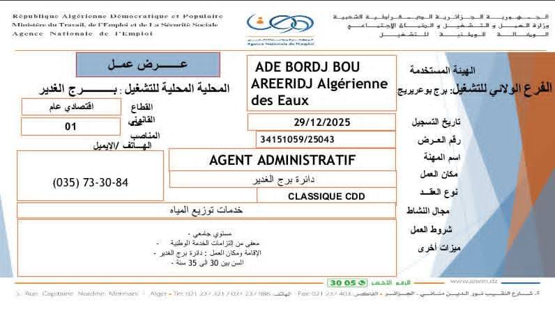الهيئة المستخدمة: ADE BORDJ BOU ARRERIDJ Algérienne des Eaux
