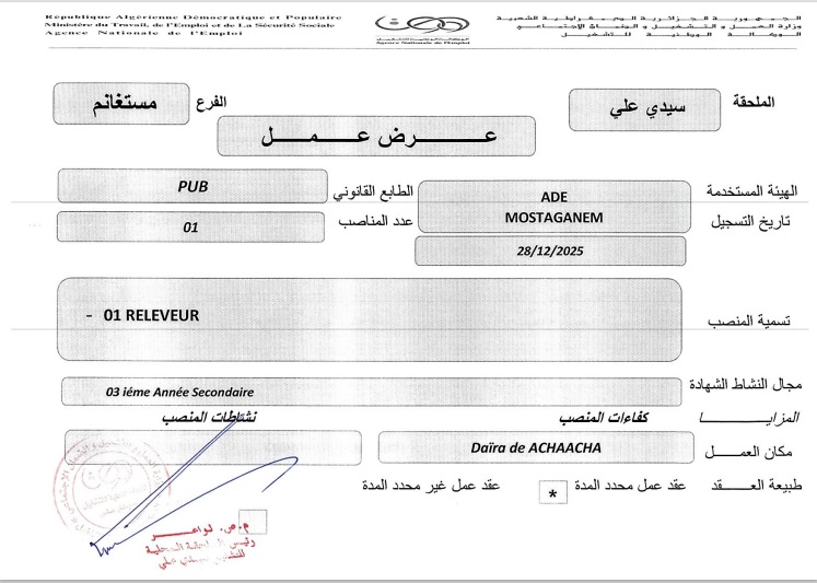 الهيئة المستخدمة: ADE MOSTAGANEM (الجزائرية للمياه – مستغانم)