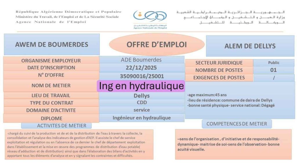 الهيئة المستخدمة: ADE Boumerdes (الجزائرية للمياه – بومرداس).
