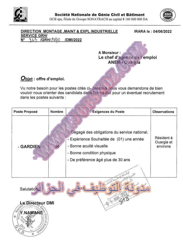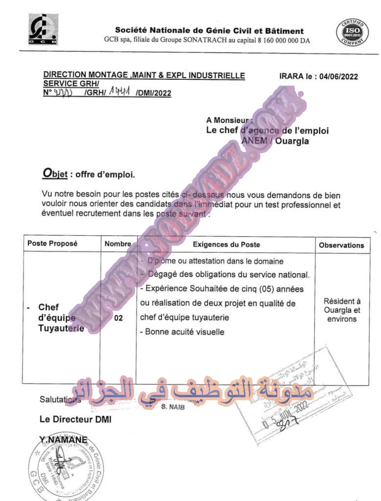 شركة وطنية هامة (شركة GCB فرع من شركة سوناطراك) توظف في الإختصاصات التالية :