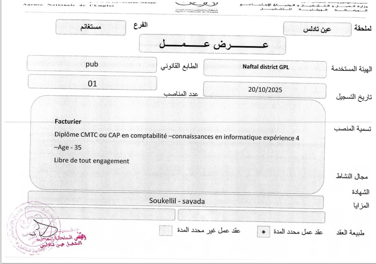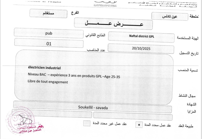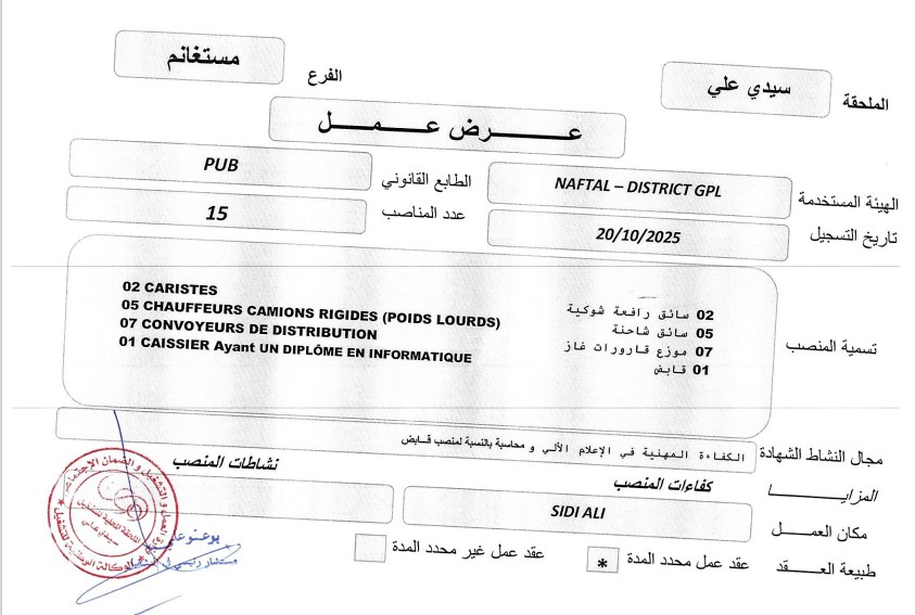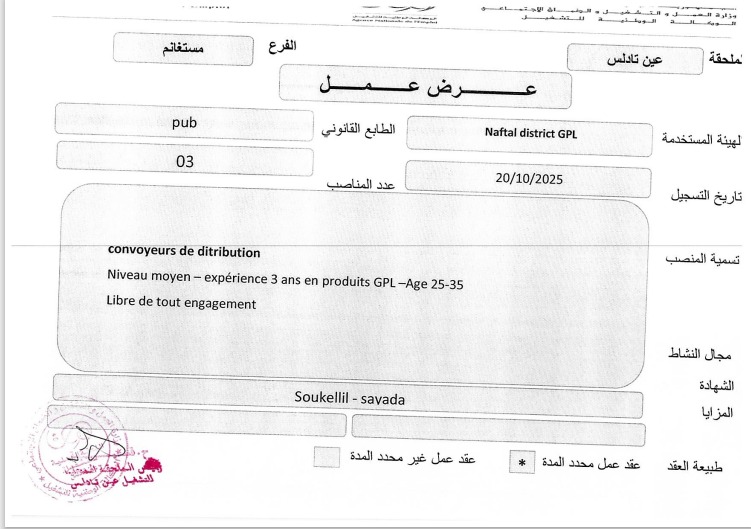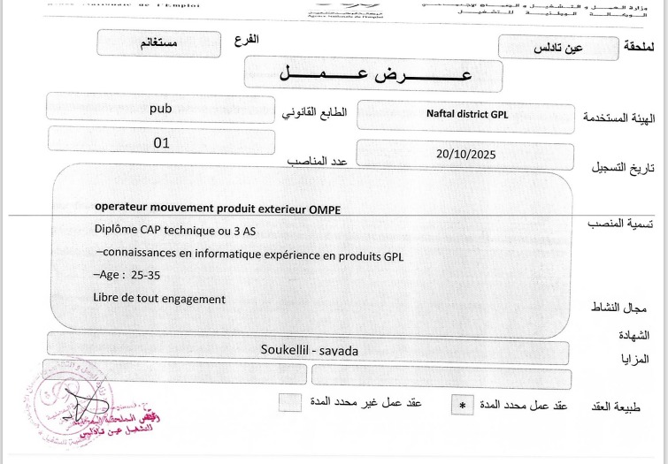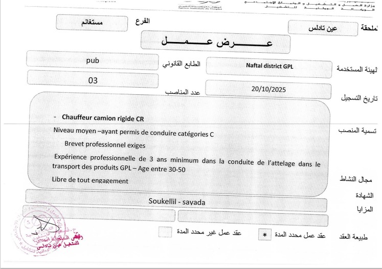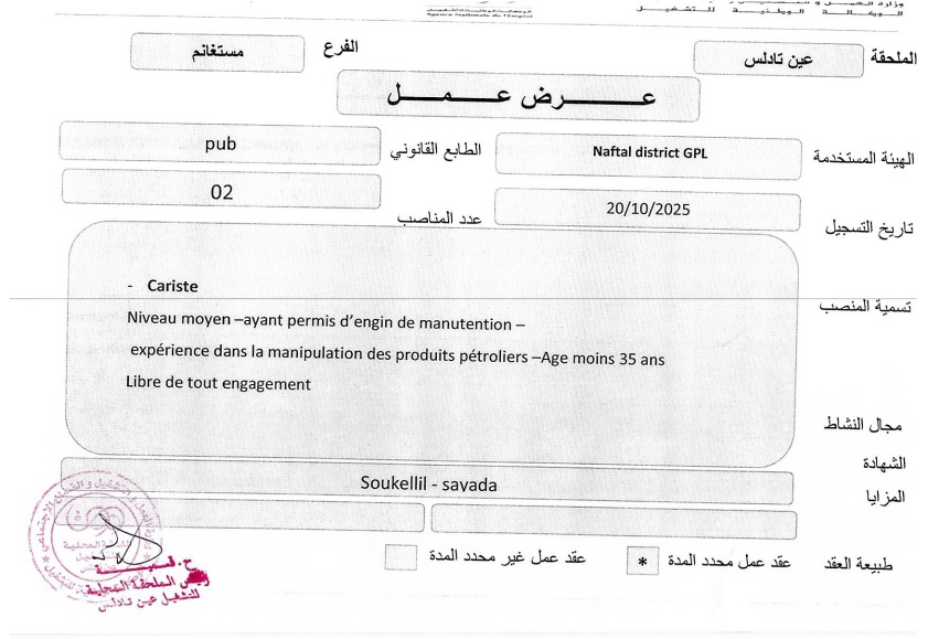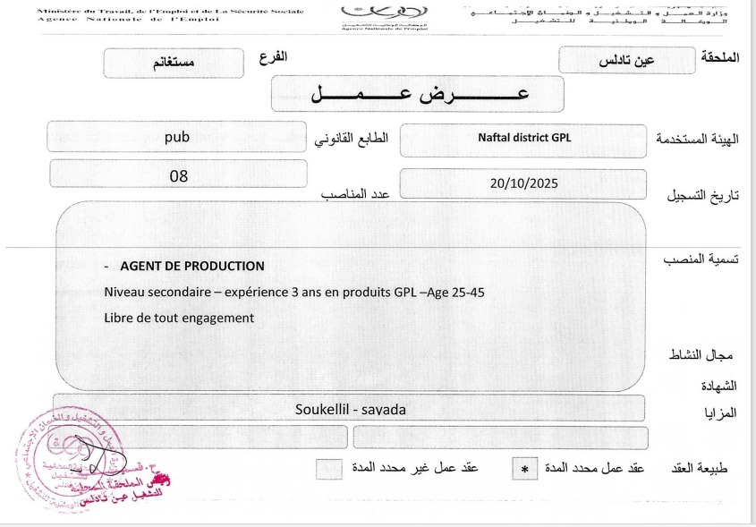 الهيئة المستخدمة: NAFTAL – DISTRICT GPL