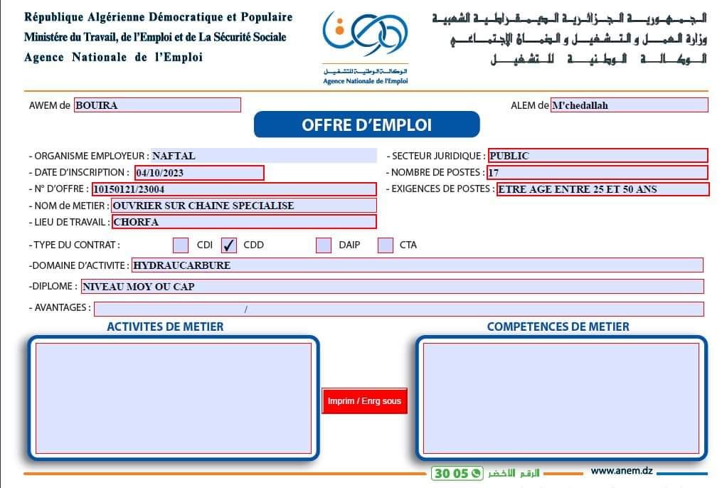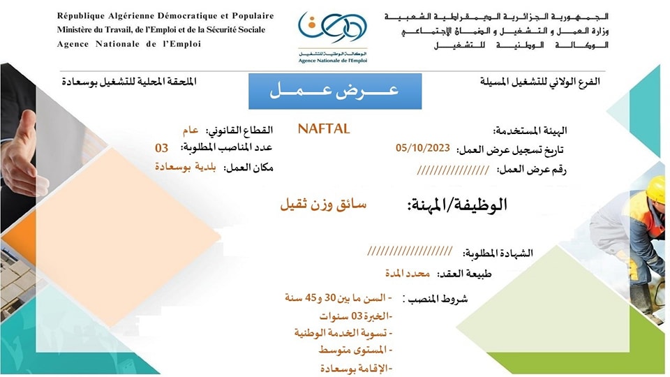 عروض عمل جديدة بشركة نفطال NAFTAL بعدة ولايات (60 منصب) شاركها Facebook Twitter LinkedIn Pinterest عروض عمل جديدة بشركة نفطال NAFTAL بولايات التالية : البويرة الشلف بوسعادة المسيلة الفرع الولائي للتشغيـل المسيلة الملحقة المحلية للتشغيل